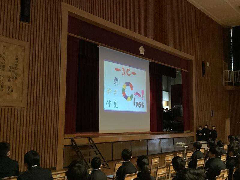 全校朝礼において、各学級からの今年1年間の振り返りが発表されました。まず、先週の学活で、今年度の初めに立てたクラス目標に対して、クラス討議を行いました。今日は、その結果を学級委員がまとめ、全校に発表しました。良かった点や成果、反省点、来年度に向けての抱負を堂々と伝えてくれました。それを聞く他の生徒も、集中して耳を傾けて、しっかりと受けとけていました。また、1•2年生から卒業生に向けたメッセージを渡すセレモニーがありました。