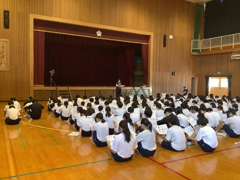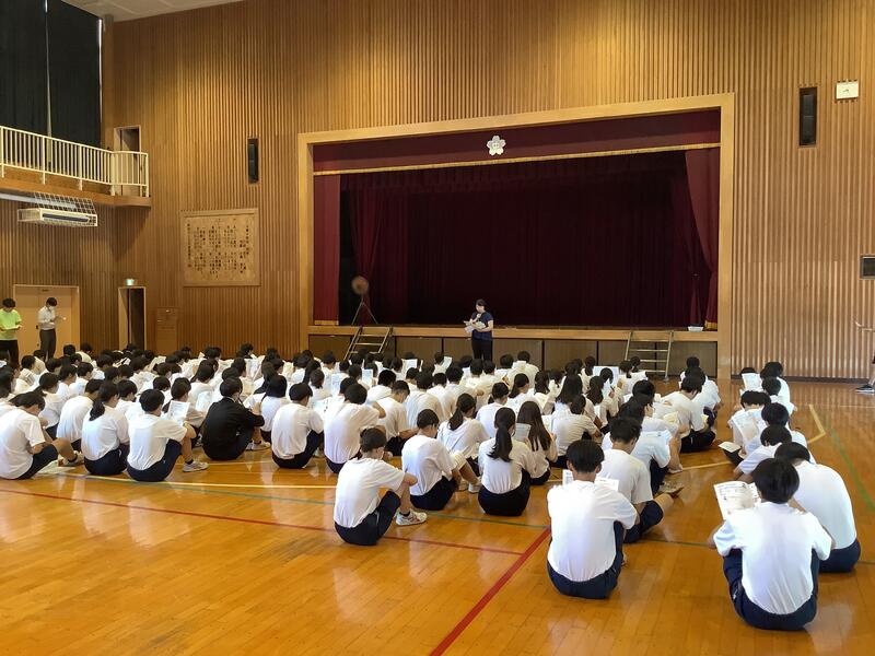 一方、2年生は、社会を明るくする運動の講演会が行われました。保護司の皆さまを講師としてお招きし、犯罪のない社会を目指すとともに、立ち直りを支えることについて学習しました。今後は、各自の考えを文章にまとめていく予定です。