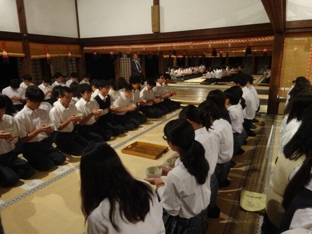 午後5時30分の班行動終了時刻の5分前には全班が班行動を無事に終え、宿泊先である京都東山のホテルりょうぜんに到着しました。(ホテルが東山の高いところにあり、着く直前の急坂でかなり消耗したようでした)入浴・夕食後、宿から徒歩で青蓮院に向かいました。お抹茶やお菓子のいただき方の作法を教えていただき、実際に食していました。その後、お坊さんの「5つの心」のお話を聞き、さらに広いお庭で奏でる琴の調べに耳を傾けました。