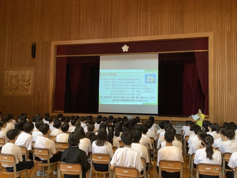 一方、2年生は、社会を明るくする運動の講演会が行われました。保護司の皆さまを講師としてお招きし、犯罪のない社会を目指すとともに、立ち直りを支えることについて学習しました。今後は、各自の考えを文章にまとめていく予定です。
