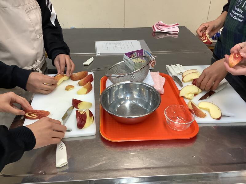 2年生が家庭科の授業で調理実習を行いました。今回は、リンゴの飾り切りのウサギと木の葉切りに挑戦しました。