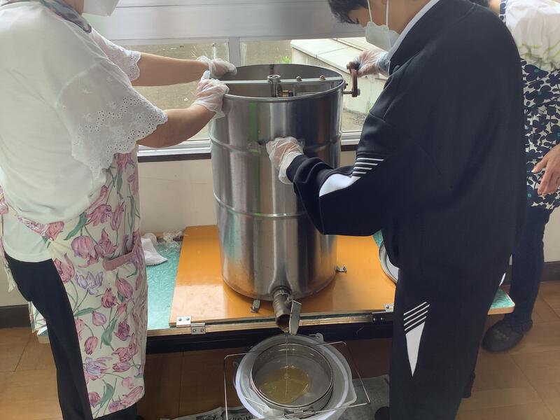 チャレンジ部で行なっている養蜂活動において、10日土曜日にハチミツの採取をしました。前回予定していた日程が、雨で中止になってしまい、生徒にとっては今回が今年度初めての採蜜体験となりました。参加生徒は16人、蜜蓋取り•スズメバチのトラップ設置•巣箱担当など、仕事を分担しながら作業を行いました。ご指導してくださった地域学校協働本部や地域の専門家の皆様からは、生徒は皆とても動きがよく、自分から仕事を探したり、やるべきことがないかを積極的に聞くなどして、主体的な活動ができていたとお褒めの言葉をいただきました。