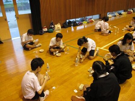 震災時の生活を想定し、避難所で自分たちがとるべき行動や態度、様々な防災講習から実践的な救命技術や防災の知識を学びました。夕食は、火起こしからはじめ、アルファ化米・豚汁を食べました。また、東日本大震災、阪神・淡路大震災についての講話を聞きました。夜は体育館と談話室に災害用の毛布とマットで就寝しました。