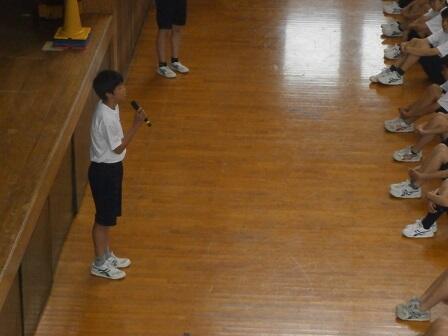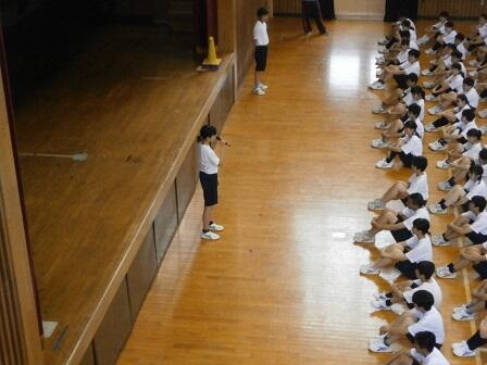 5月10日(火)4校時に第1回運動会練習を行いました。体育行事実行委員長、平井夕希菜さん、副実行委員長、安部裕貴君、新田先生のお話を受け止め、「熱い運動会」になるよう努力しましょう。この日は雨のため体育館を使っての練習でしたが、限られたスペースを活用し、ラジオ体操、行進の動きの確認など、充実した練習になりました。