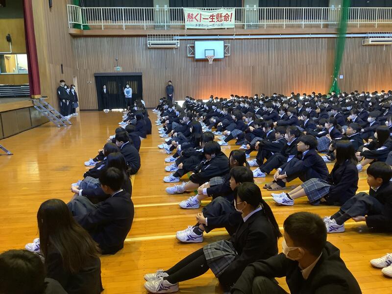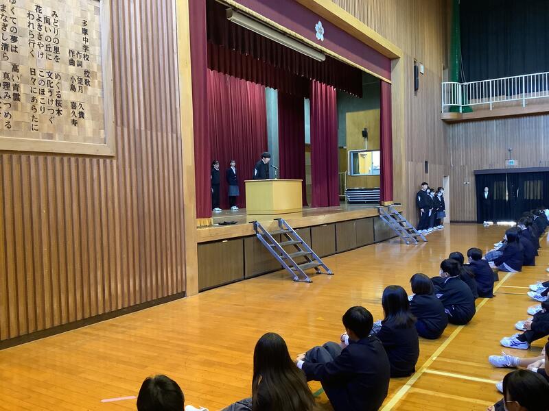 昨日の委員会の開催を受け、生徒会朝礼が行われました。各委員長から委員会で話し合われたことの報告などが伝えられました。生徒会本部からは、書き損じハガキキャンペーンへの協力依頼がありました。これは、恵泉女学園大学が中心に行っている取組に多摩市全体として協力していこうというものです。年賀状以外でも書き損じのハガキがあれば是非持ってきてもらえればと思います。