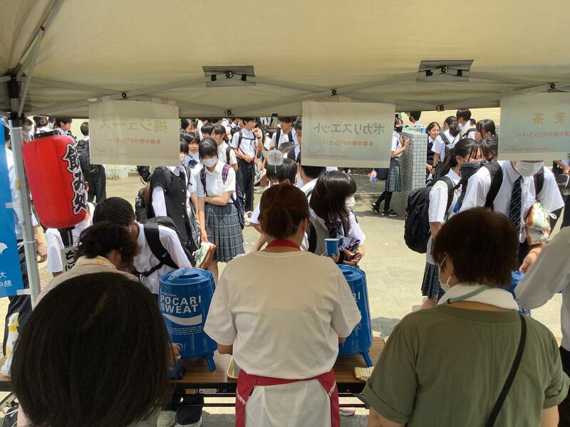 今年度2回目のドリンクバーとなりました。下校時に合わせ、地域学校協働本部とPTAの方々のご協力により、麦茶•スポーツドリンク•多摩中特製梅ジュースが大きなジャグに幾つも用意されました。気温が上がる中、生徒は冷たい飲み物に舌鼓を打っていました。協力していただいた方々へのお礼の言葉もしっかりと伝えられていました。