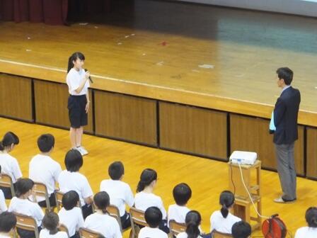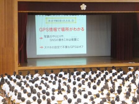7月9日(土)5時間目、体育館で全校生徒と保護者、地域の方を対象にセーフティ教室を開催しました。講師にKDDIの松岡さんをお招きして、「スマホ・ケータイでのトラブル・個人情報」をテーマに具体的なトラブル、犯罪事例などを紹介していただきました。また、「自分の軽率な行為がどのようなことを引き起こすのか」「事前の対策はどのようにすればよいか」など指導いただきました。全校生徒を代表して、生徒会長の土井琉志亜さんからお礼のことがありました。