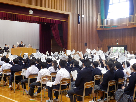 5月7日(火)の5・6校時、全校生徒が体育館に集まり、生徒総会が行われました。