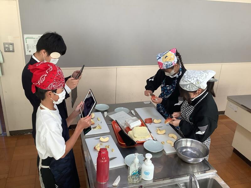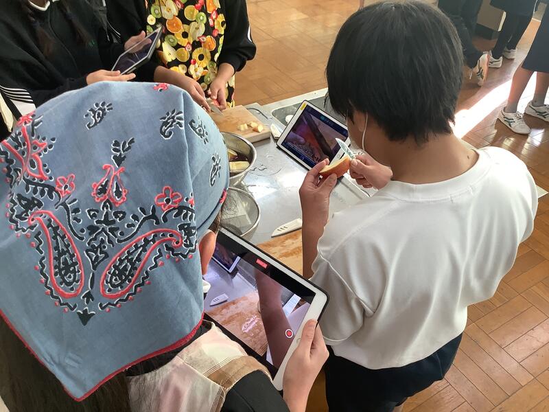 さて、1年生の家庭科の授業では、りんごの飾り切りが行われていました。具体的には、うさぎの飾り切りと木の葉の飾り切りが行われました。お互いに教えあったり、動画を撮影し合いながら作業が進められました。一生懸命に取り組んでいました。