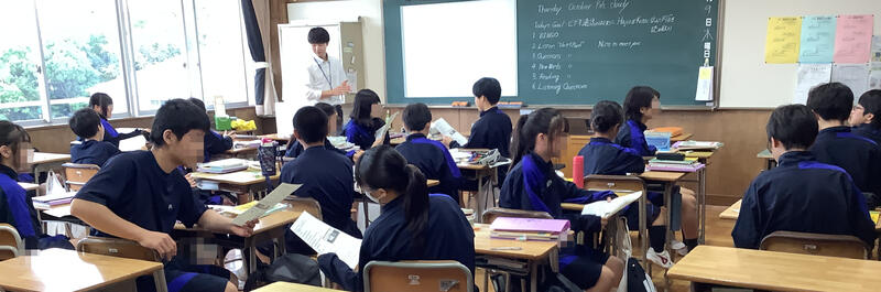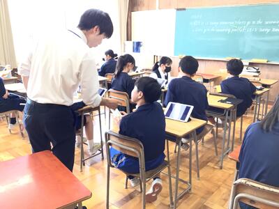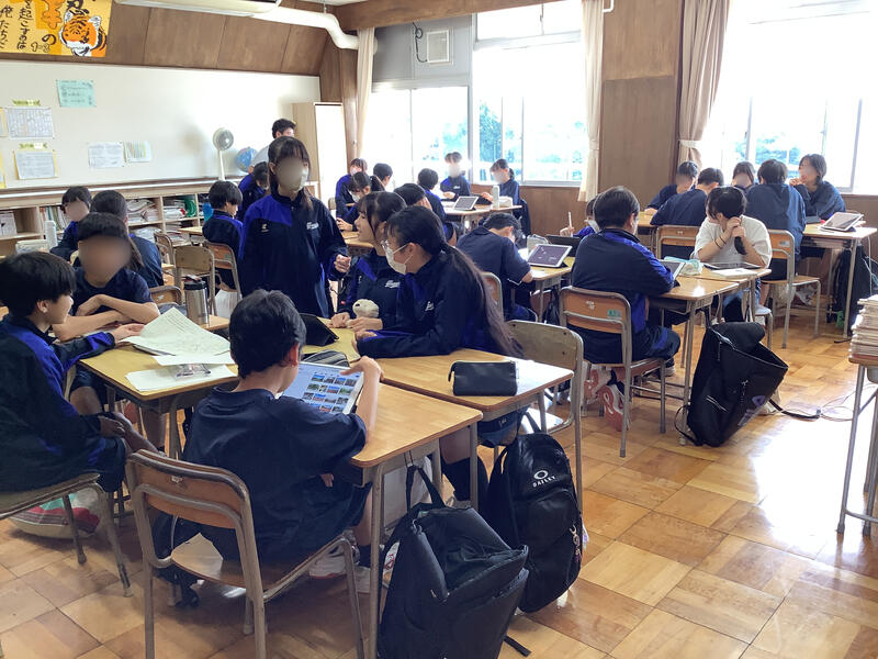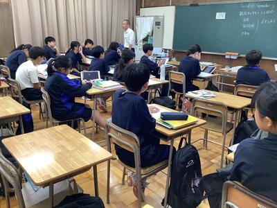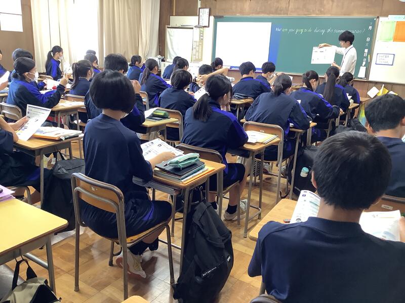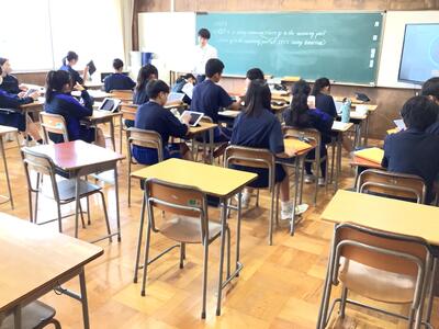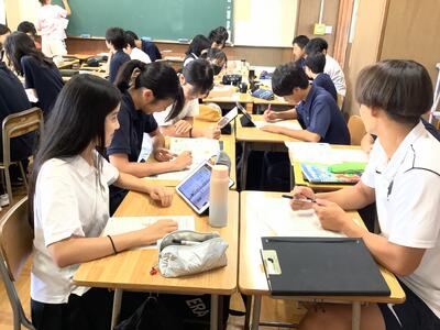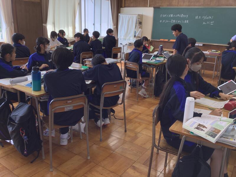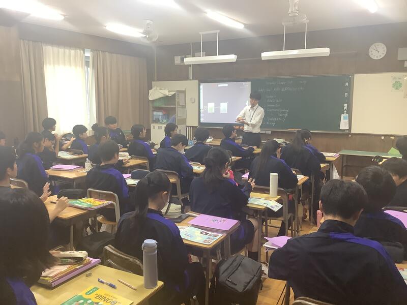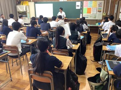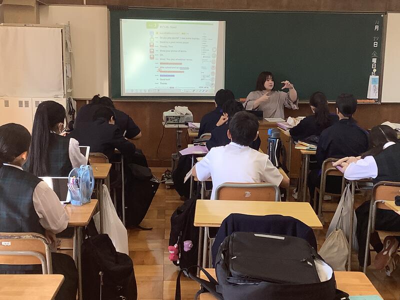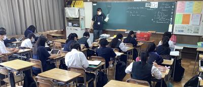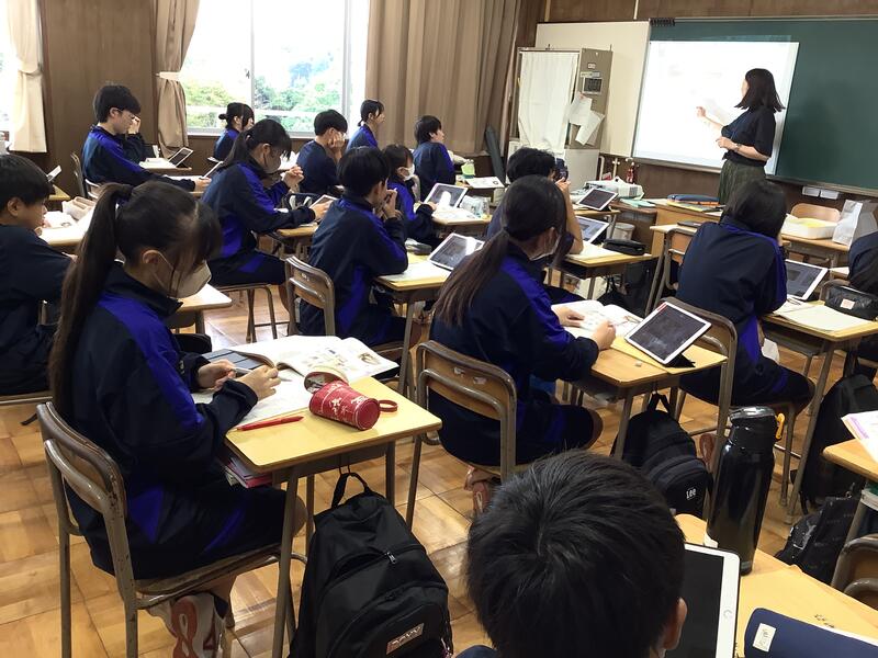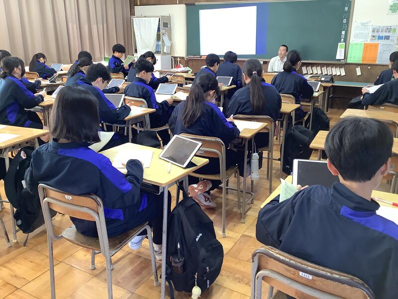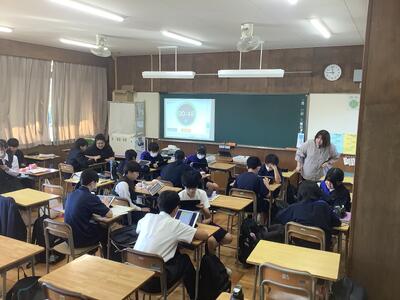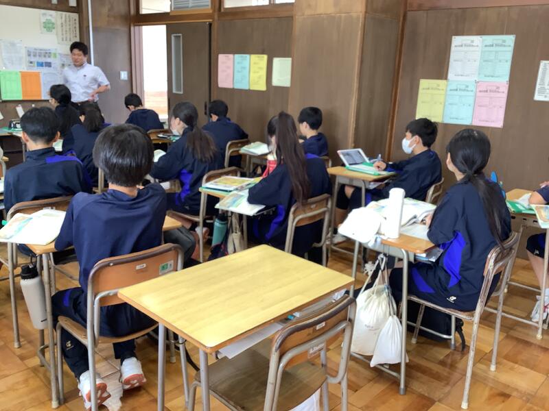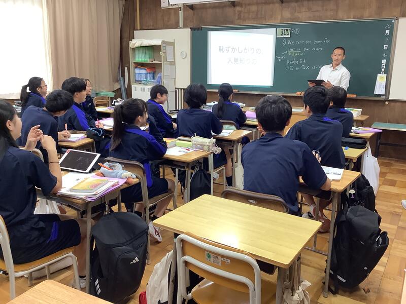 3年生の英語です。ペアになり、トピックについての会話のあと、先生とのやり取りで自分のことを伝えて仲間と共有していました。中学校生活で思い出に残っていることは修学旅行であることを伝えた後、更に詳細なエピソードをやり取りしていました。