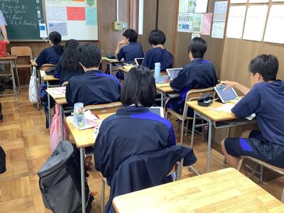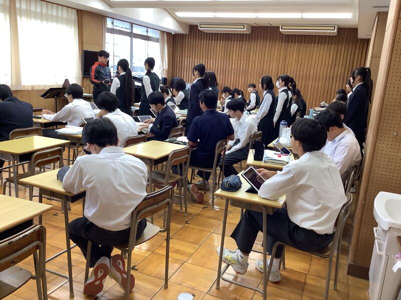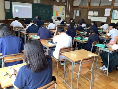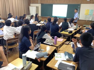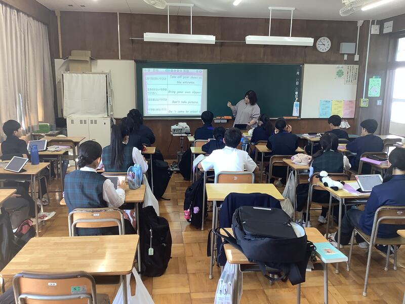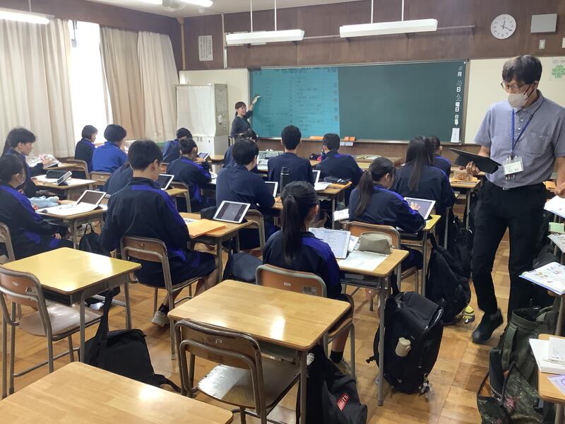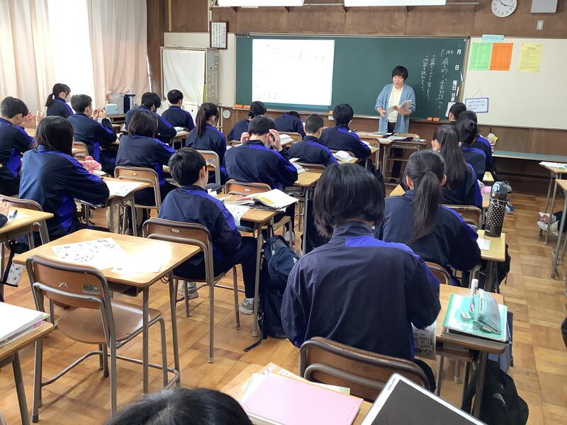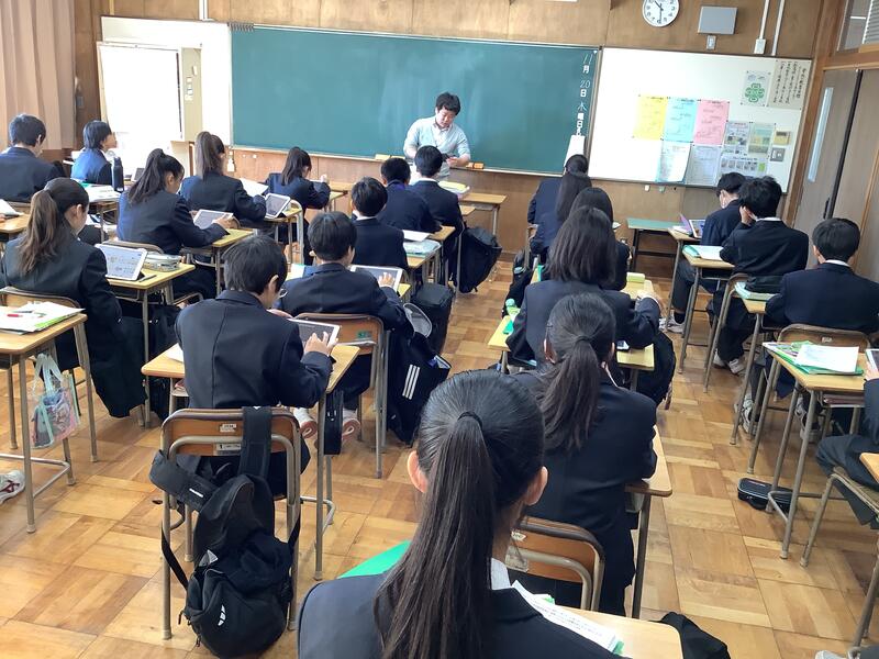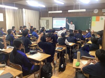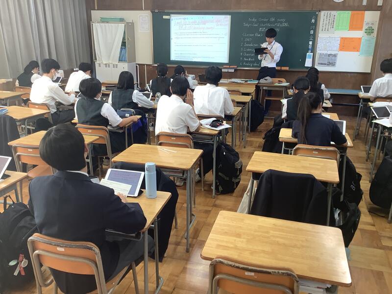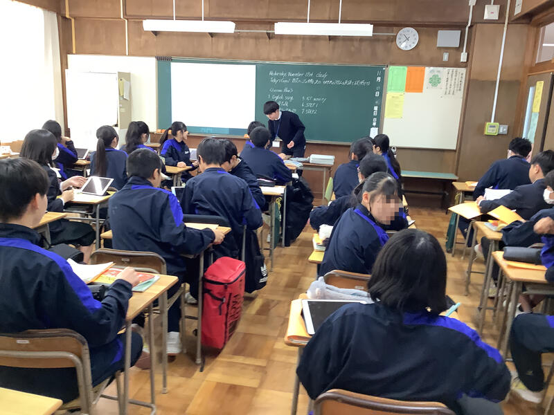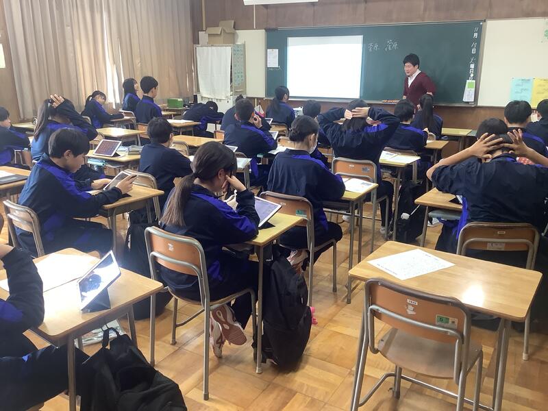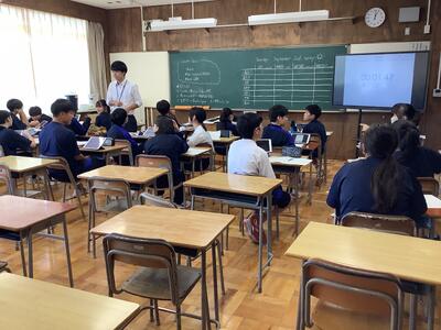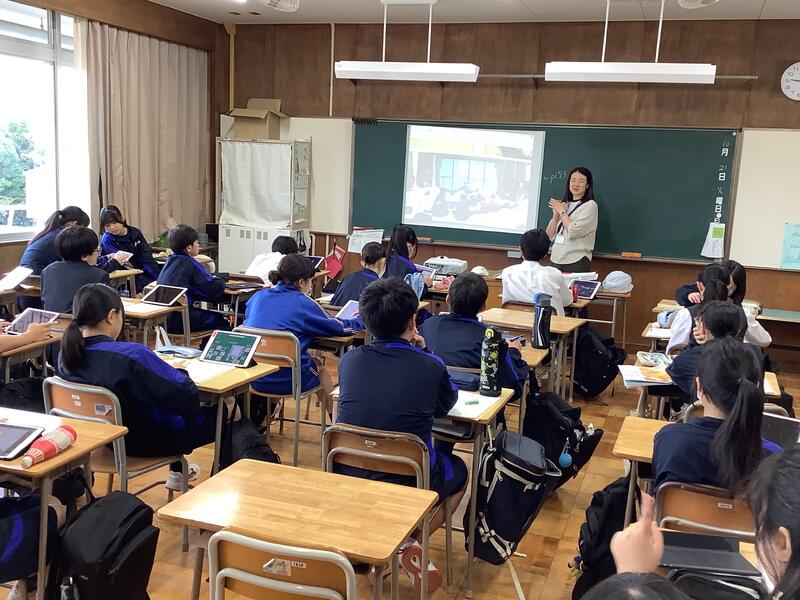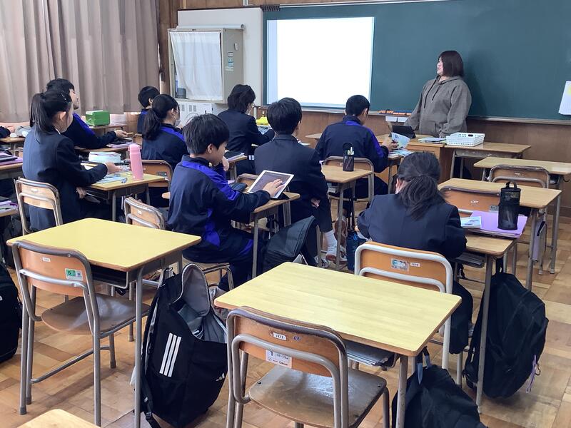 3年生の英語です。ペアになり、トピックについての会話のあと、先生とのやり取りで自分のことを伝えて仲間と共有していました。中学校生活で思い出に残っていることは修学旅行であることを伝えた後、更に詳細なエピソードをやり取りしていました。