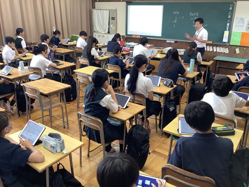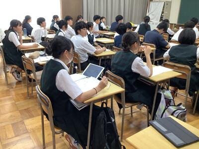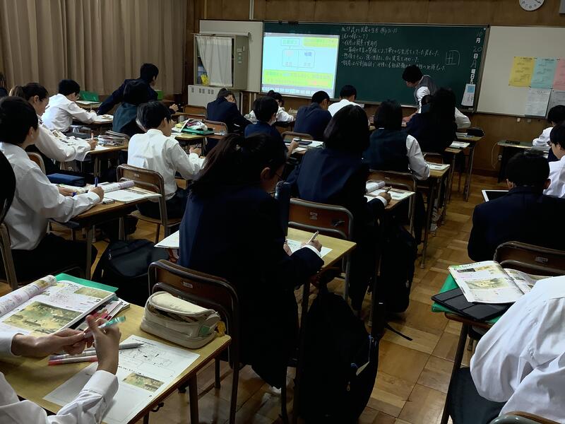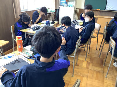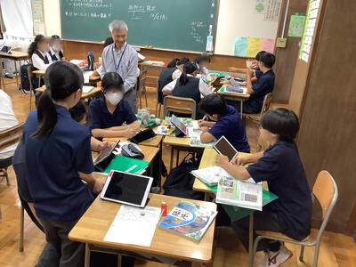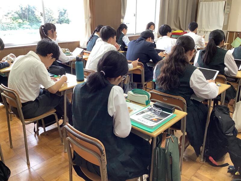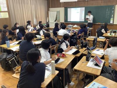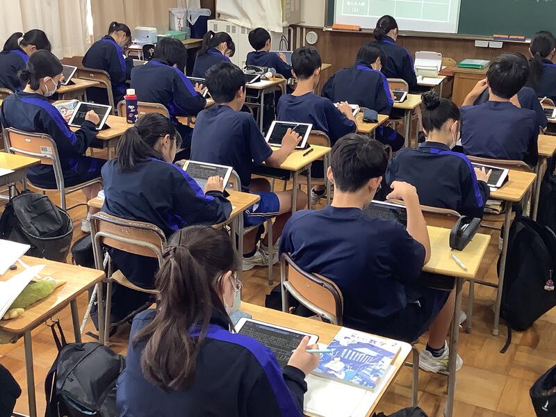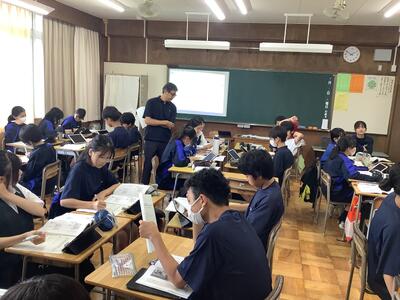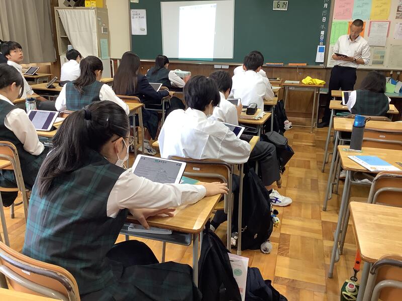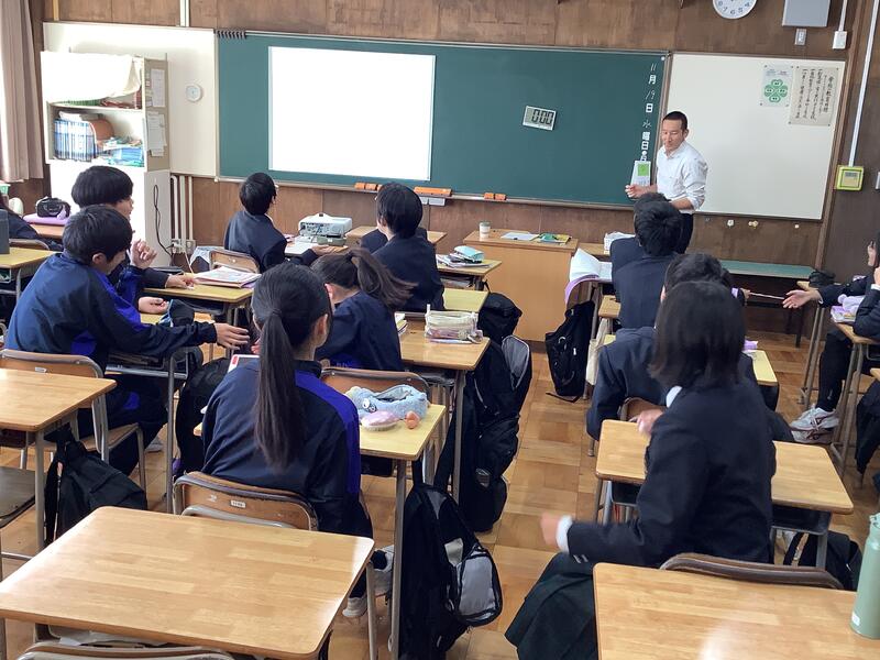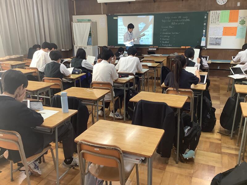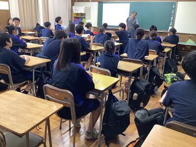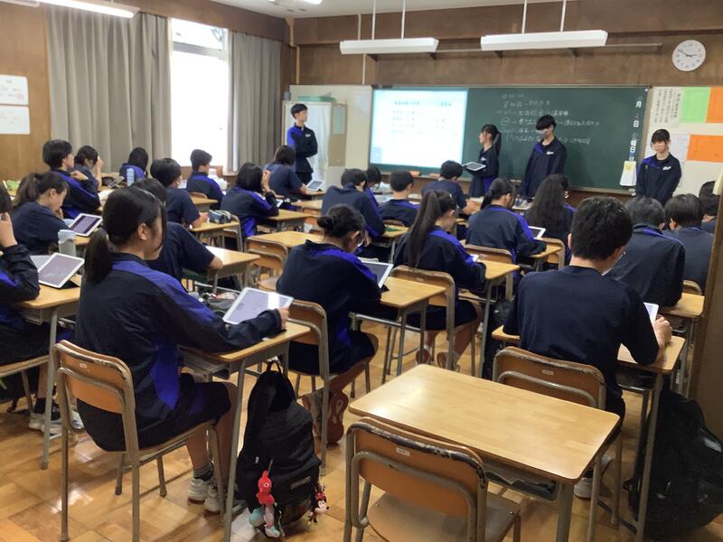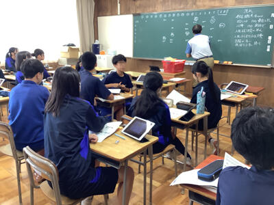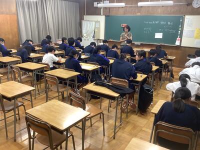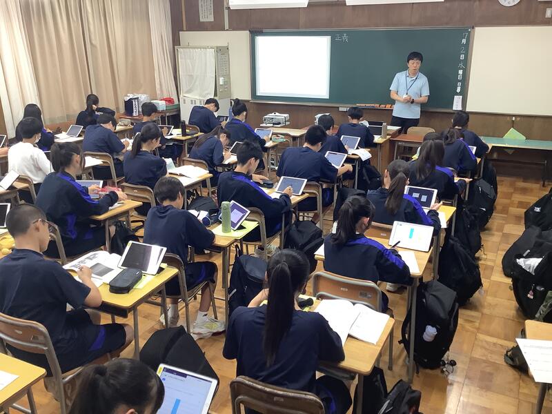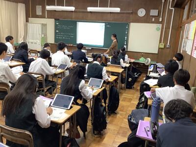 3年生の英語です。ペアになり、トピックについての会話のあと、先生とのやり取りで自分のことを伝えて仲間と共有していました。中学校生活で思い出に残っていることは修学旅行であることを伝えた後、更に詳細なエピソードをやり取りしていました。