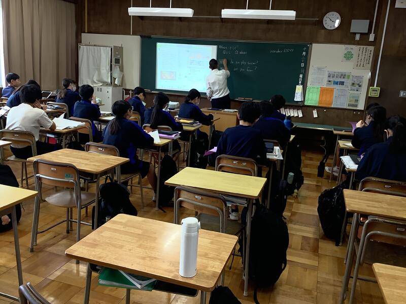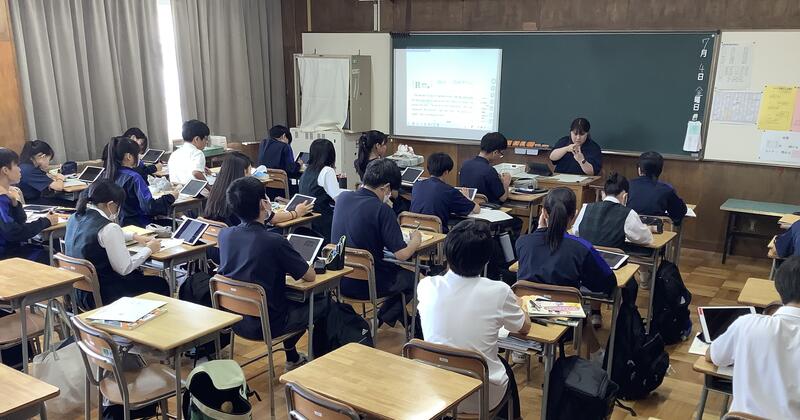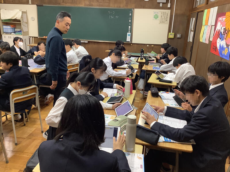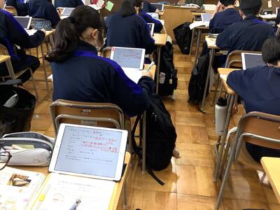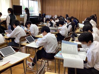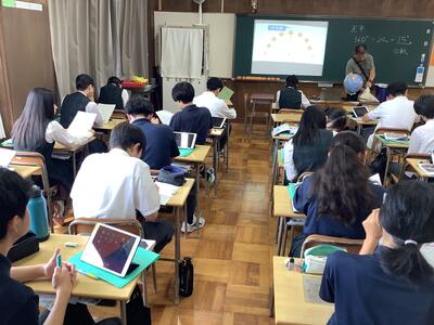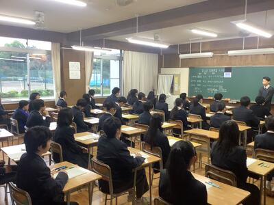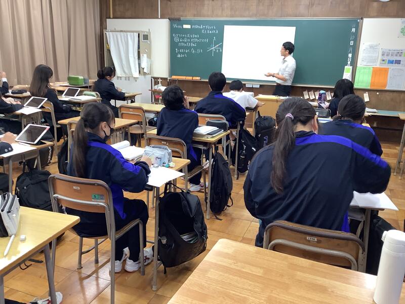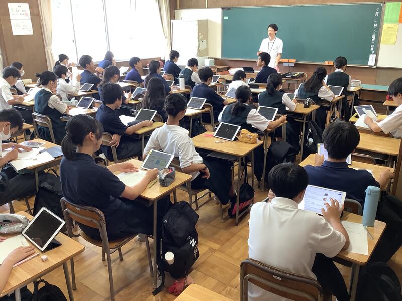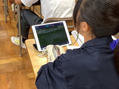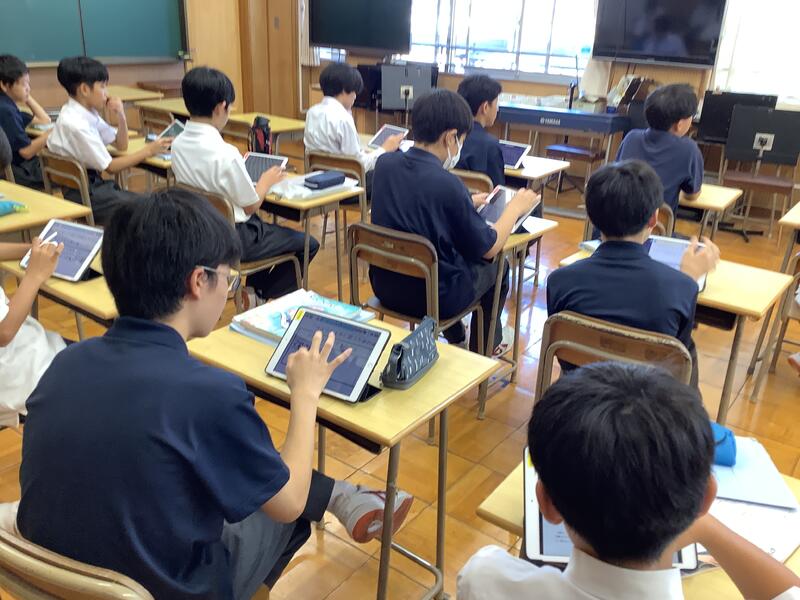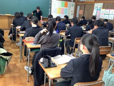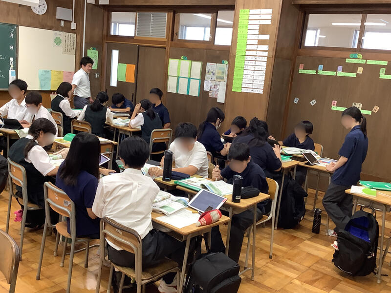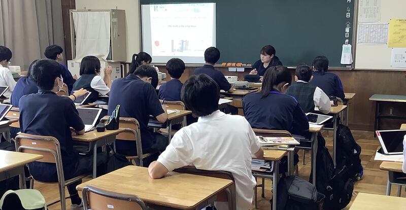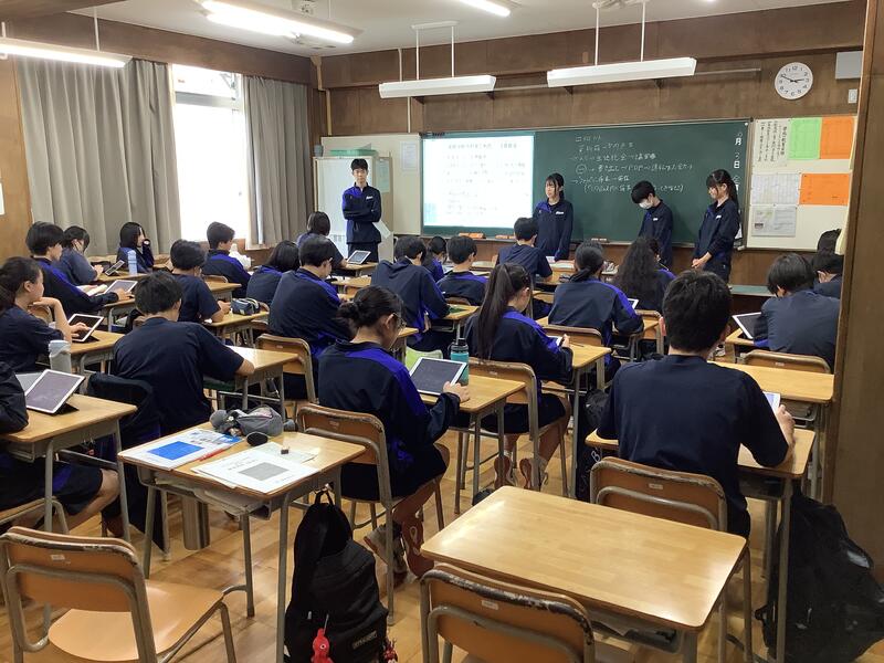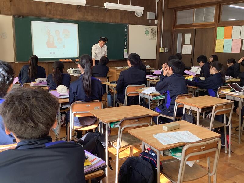 3年生の英語です。ペアになり、トピックについての会話のあと、先生とのやり取りで自分のことを伝えて仲間と共有していました。中学校生活で思い出に残っていることは修学旅行であることを伝えた後、更に詳細なエピソードをやり取りしていました。
