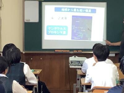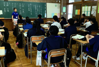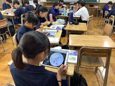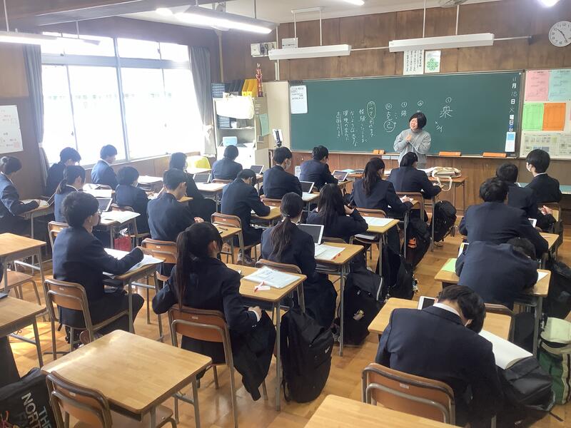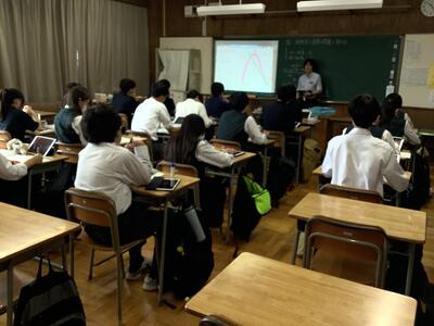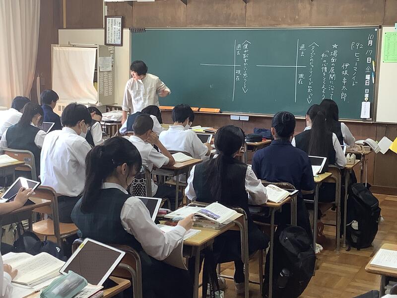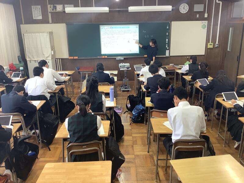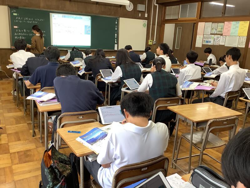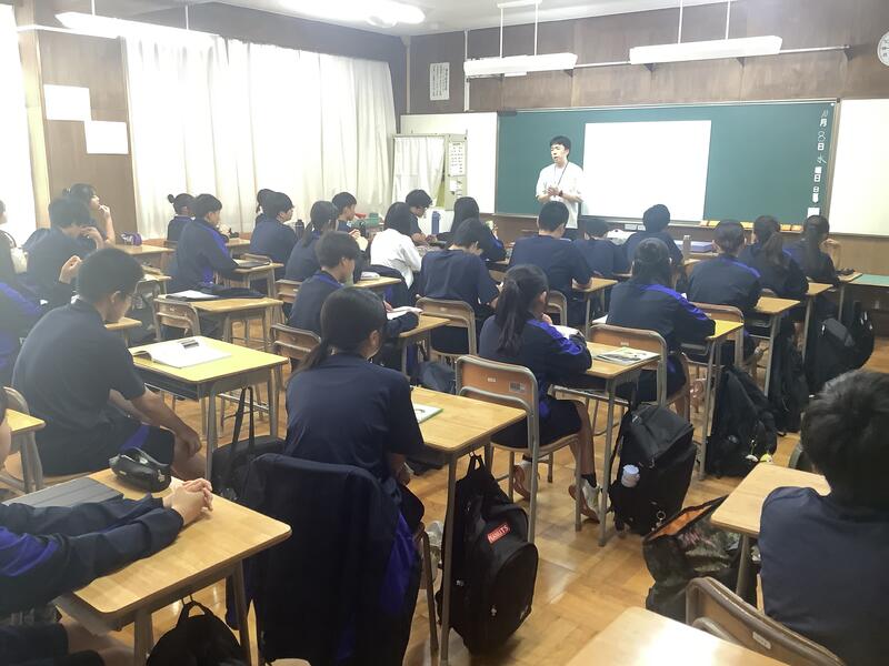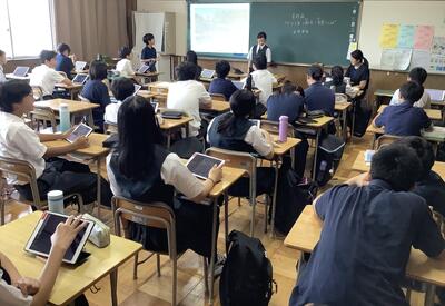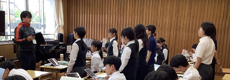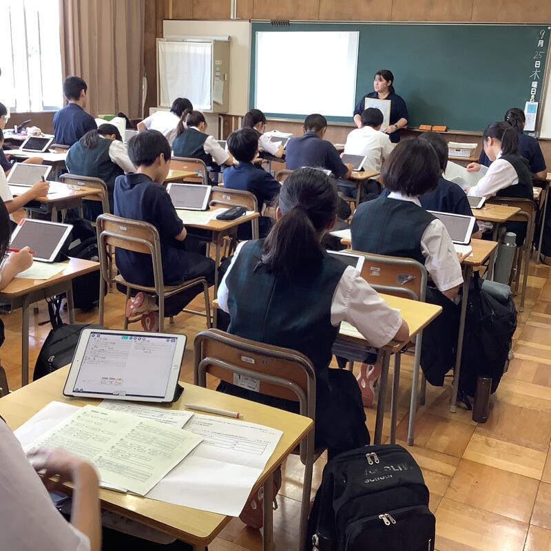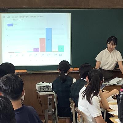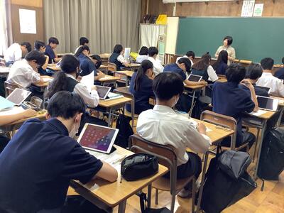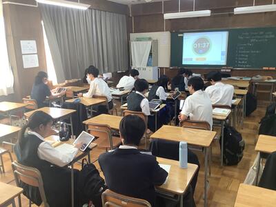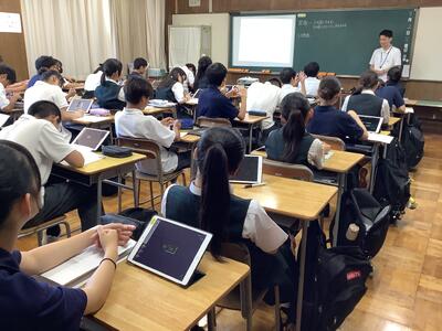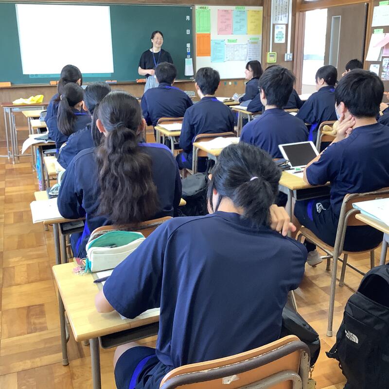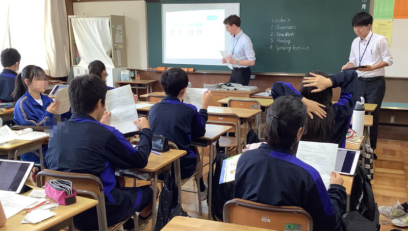3年生の英語です。ペアになり、トピックについての会話のあと、先生とのやり取りで自分のことを伝えて仲間と共有していました。中学校生活で思い出に残っていることは修学旅行であることを伝えた後、更に詳細なエピソードをやり取りしていました。