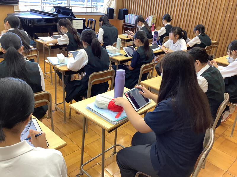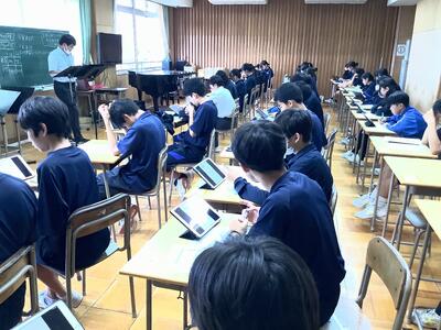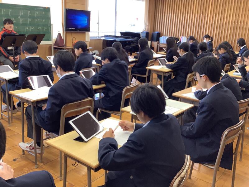 2年生の音楽では、アルトリコーダーの練習をした後に、タブレット端末を活用して振り返りを行なっていました。毎時間の振り返りを次の学習につなげるようにしましょう。