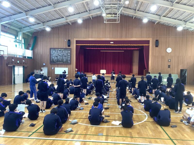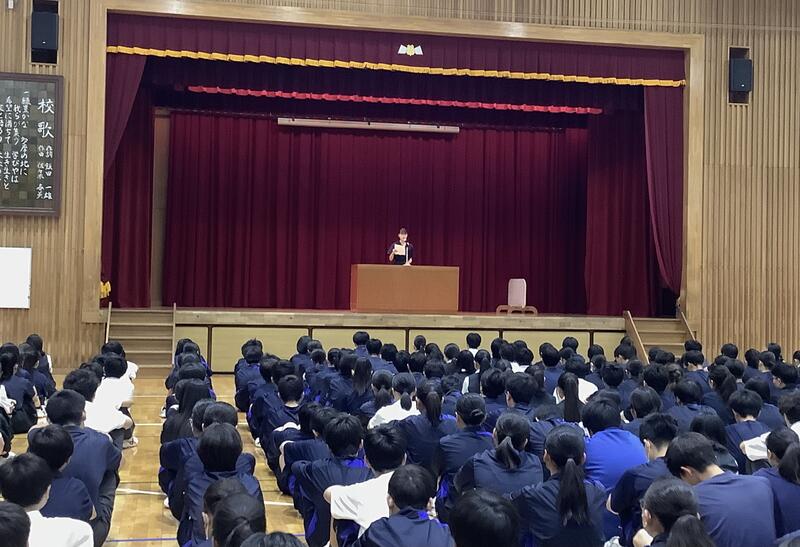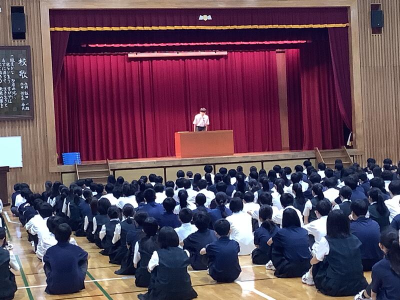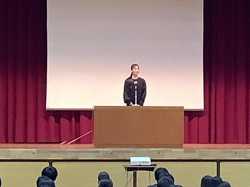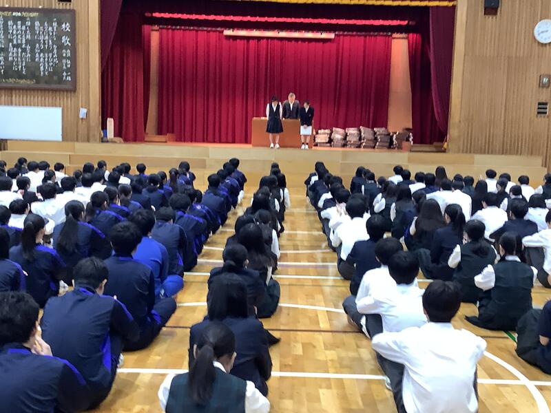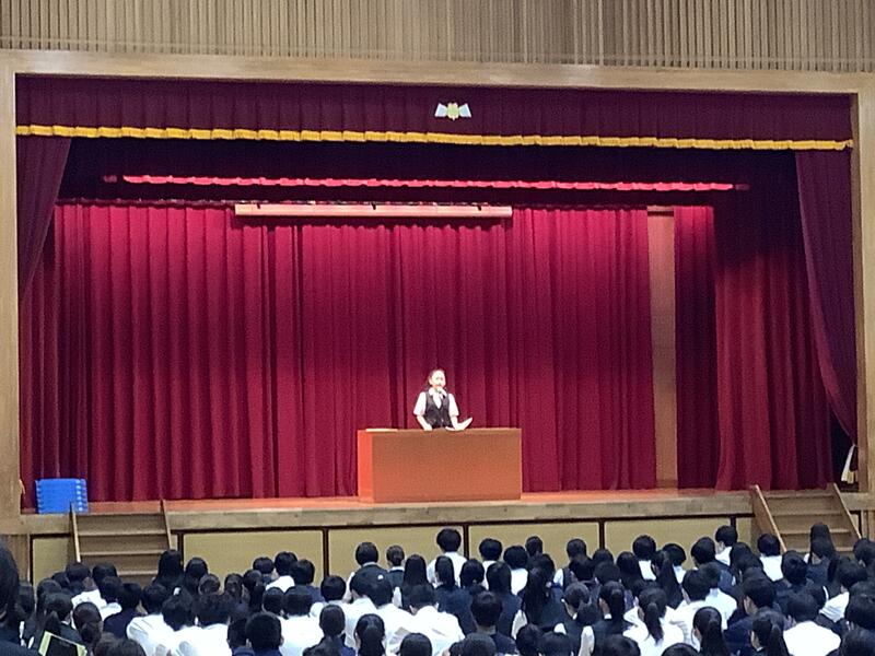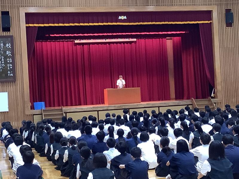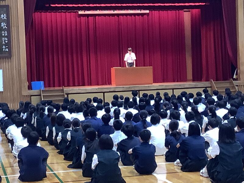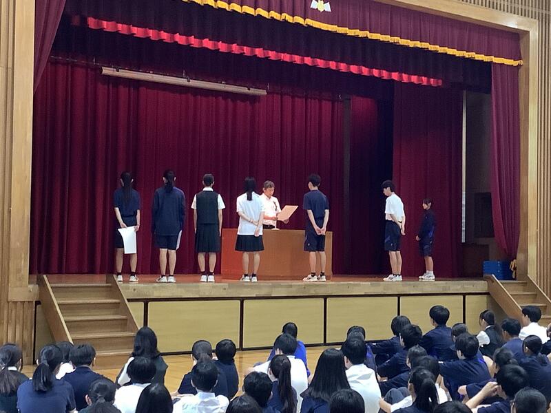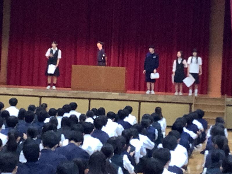 最後は生徒会役員から、クラスごとに競ったベルマーク回収の結果と表彰がありました。皆さんの協力、ありがとうございました。上位3クラスは、1位1ー4、2位3ー3、3位1ー2でした。
