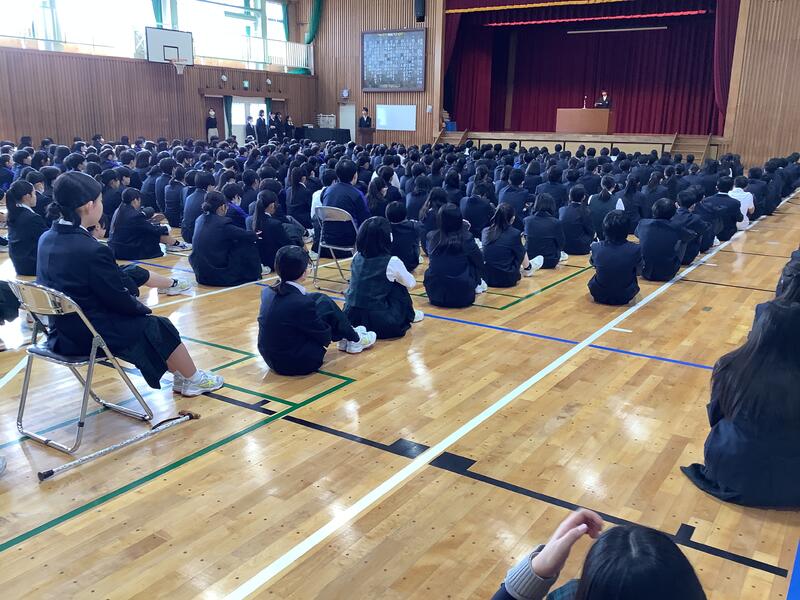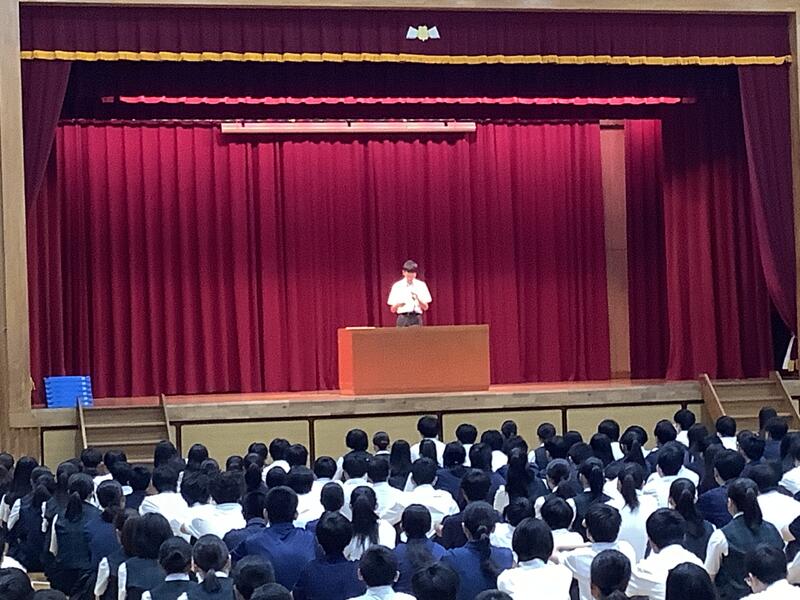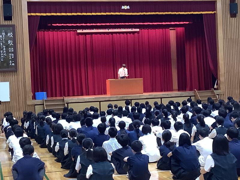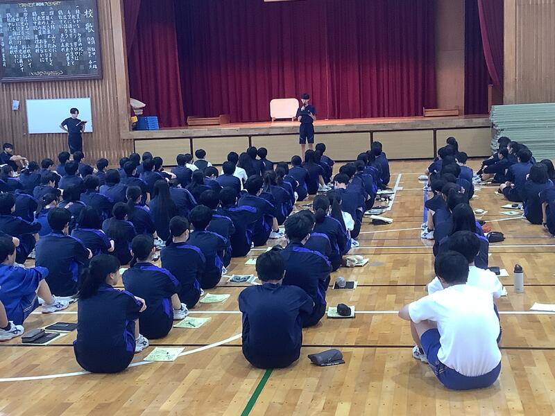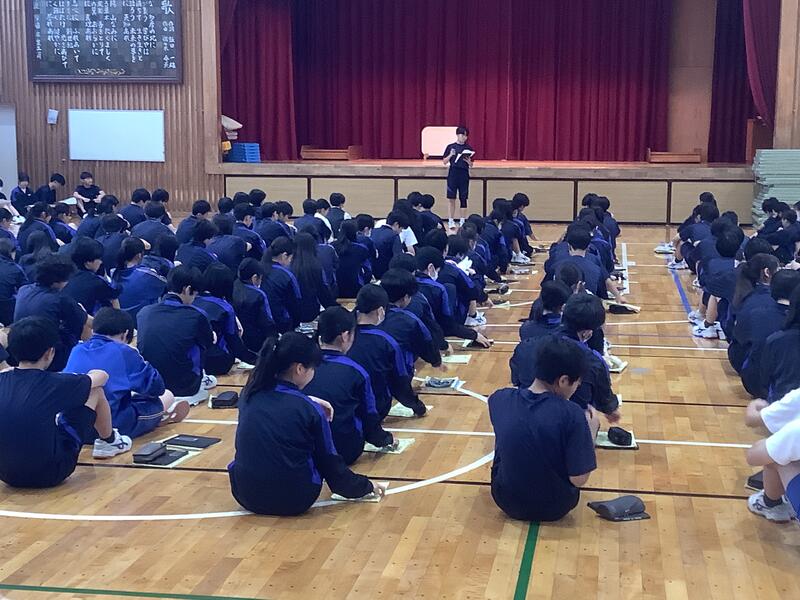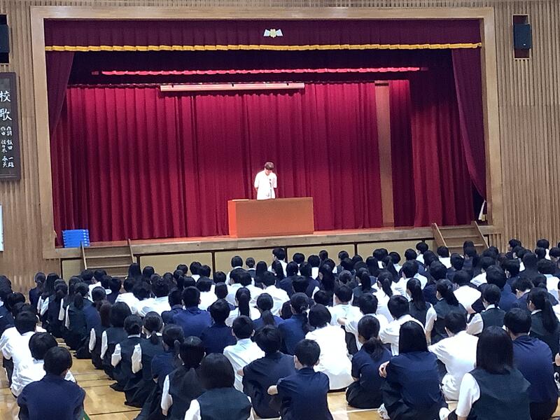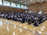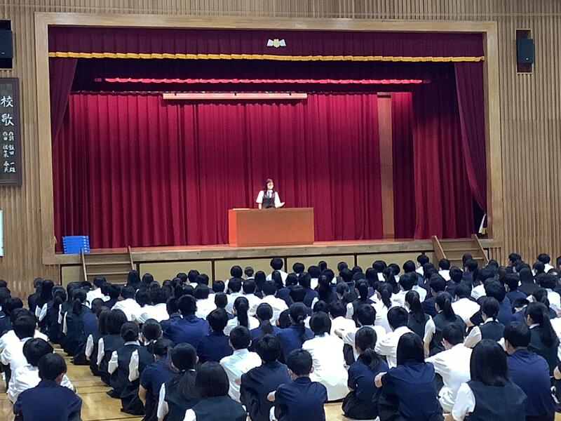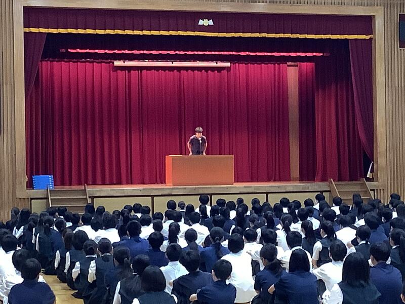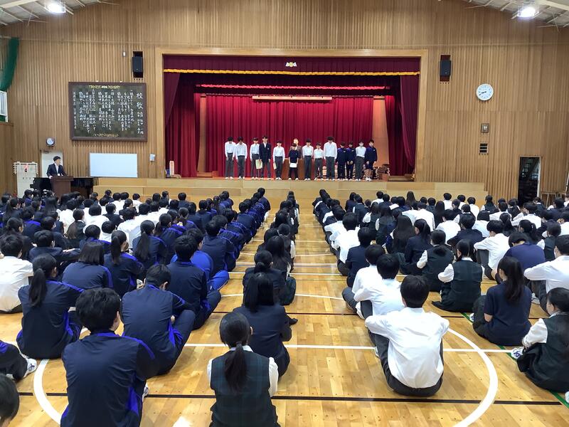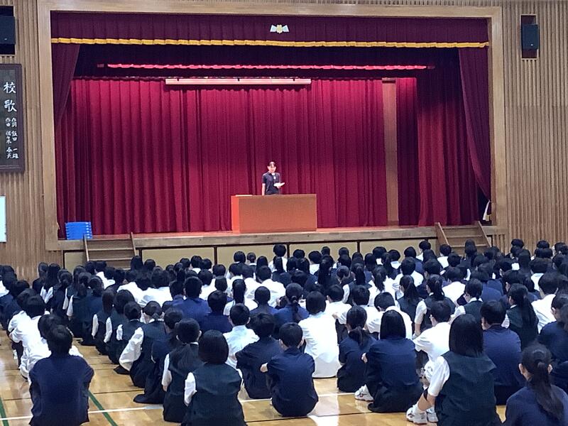 最後は生徒会役員から、クラスごとに競ったベルマーク回収の結果と表彰がありました。皆さんの協力、ありがとうございました。上位3クラスは、1位1ー4、2位3ー3、3位1ー2でした。