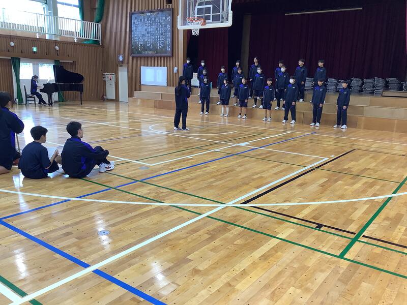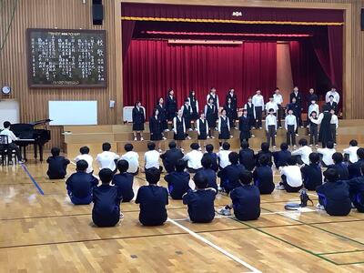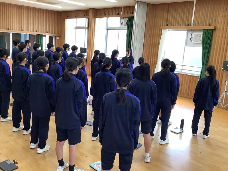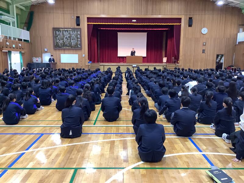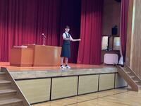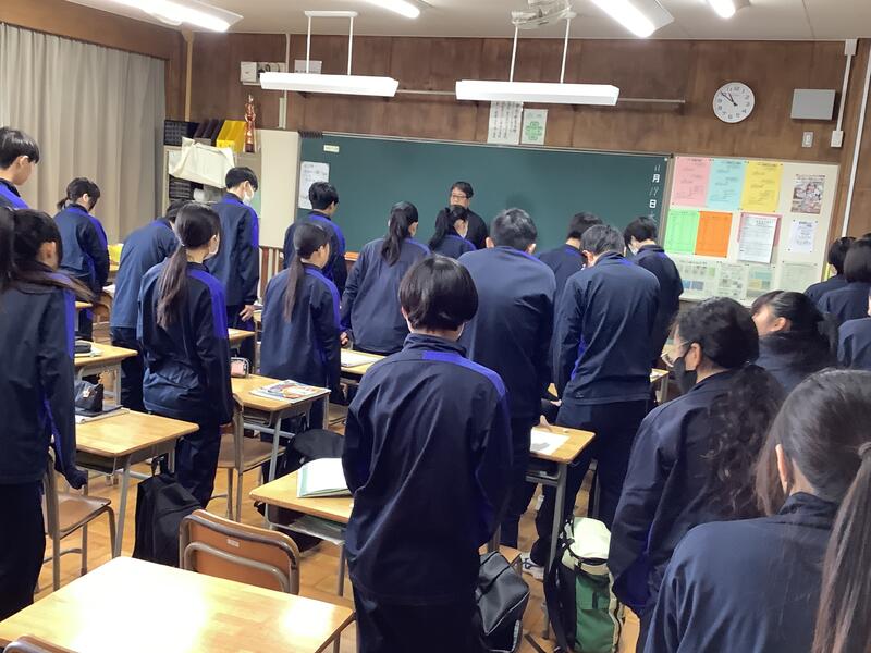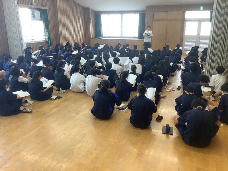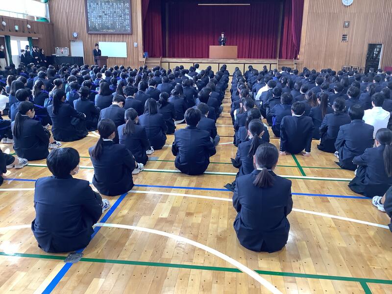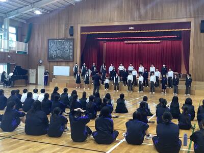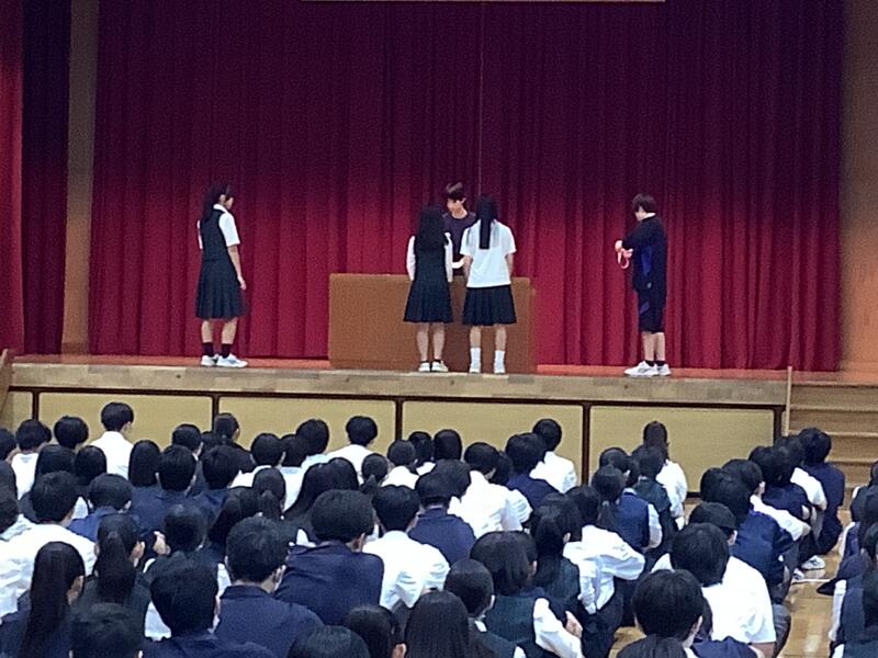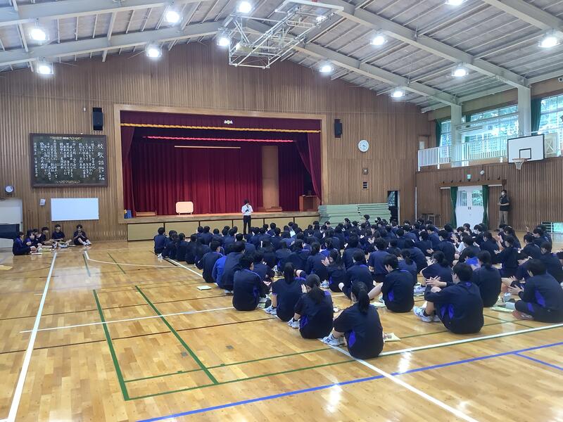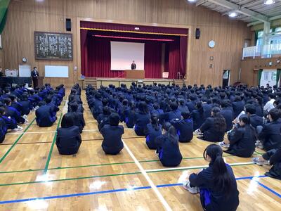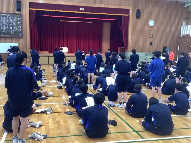 最後は生徒会役員から、クラスごとに競ったベルマーク回収の結果と表彰がありました。皆さんの協力、ありがとうございました。上位3クラスは、1位1ー4、2位3ー3、3位1ー2でした。