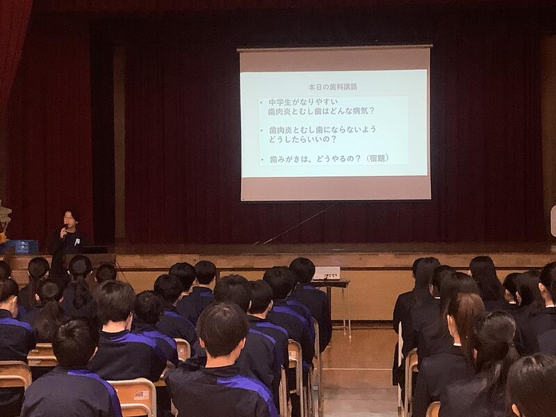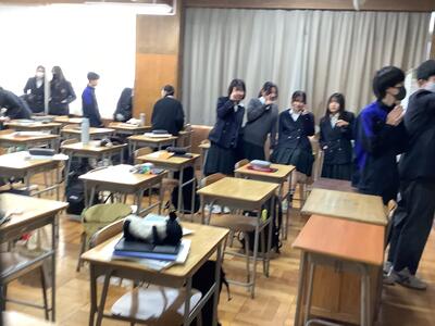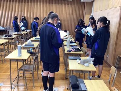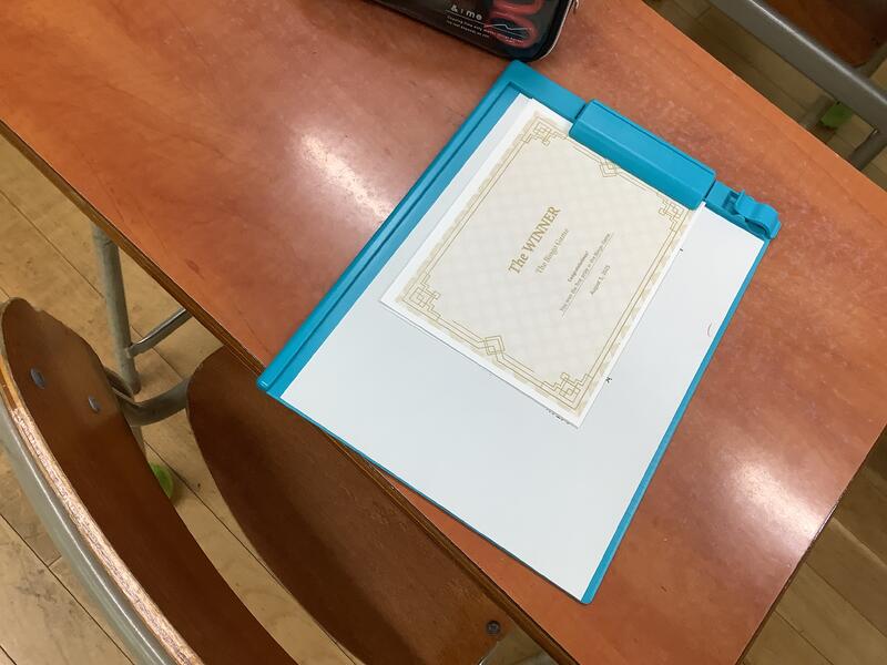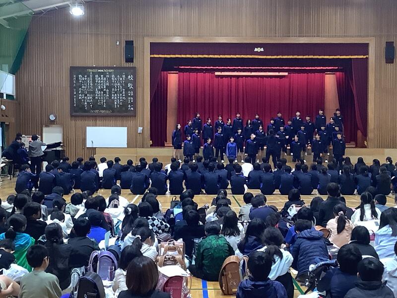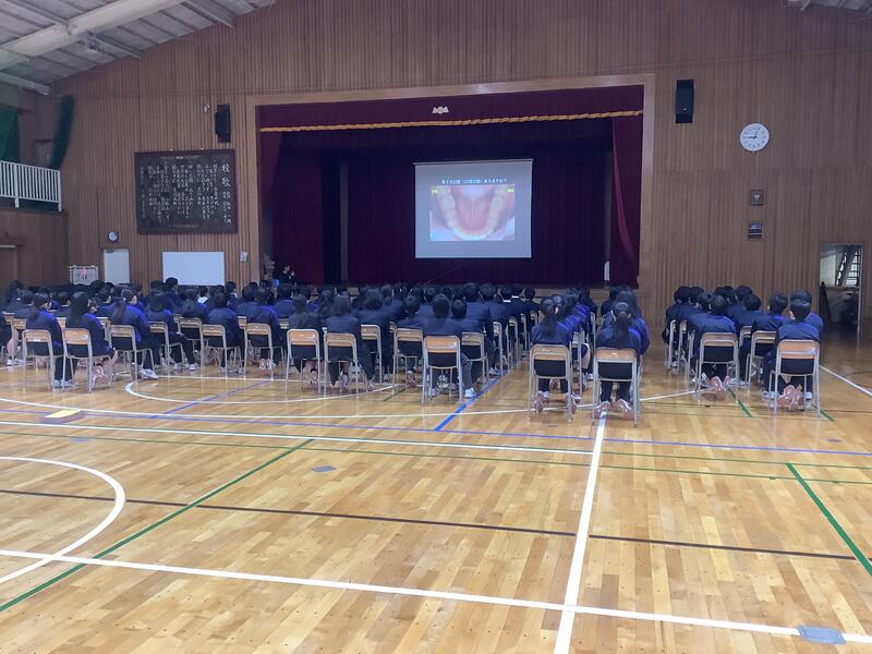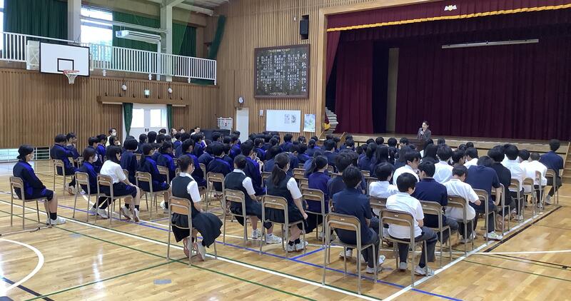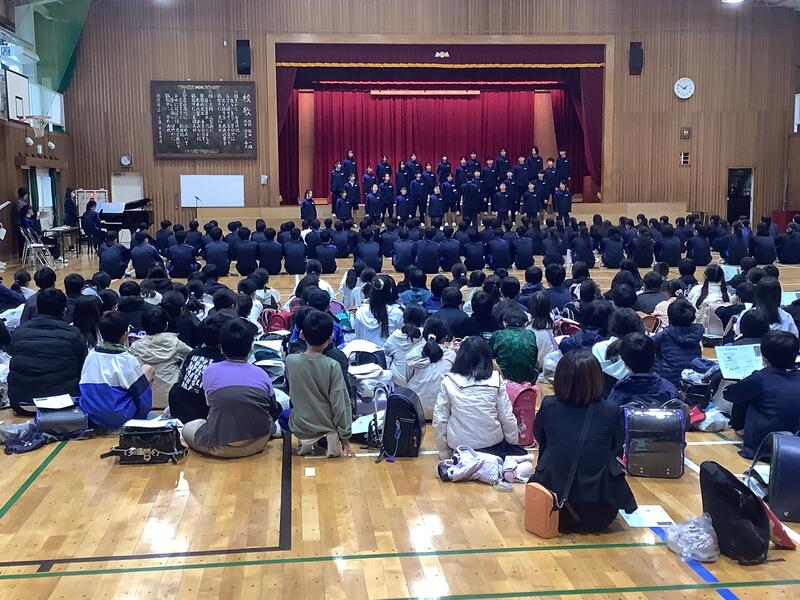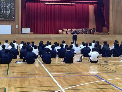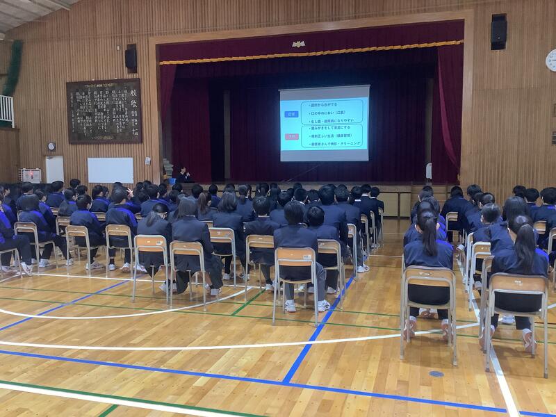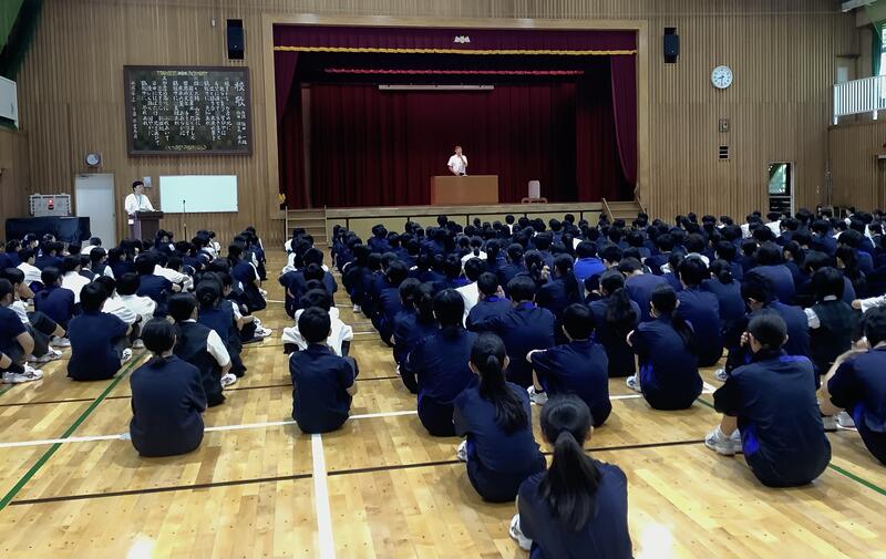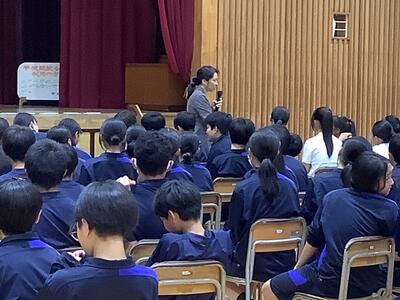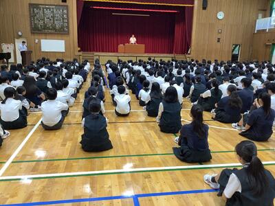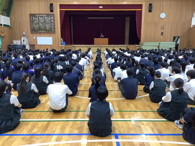 最後は生徒会役員から、クラスごとに競ったベルマーク回収の結果と表彰がありました。皆さんの協力、ありがとうございました。上位3クラスは、1位1ー4、2位3ー3、3位1ー2でした。