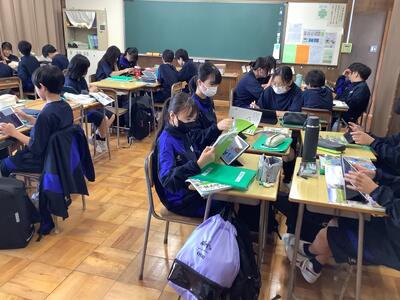 1年生の社会です。引き続き、ヨーロッパ州について、班ごとに分担して調べています。