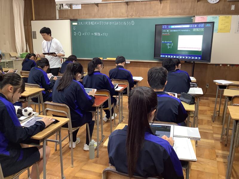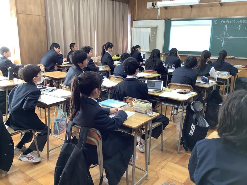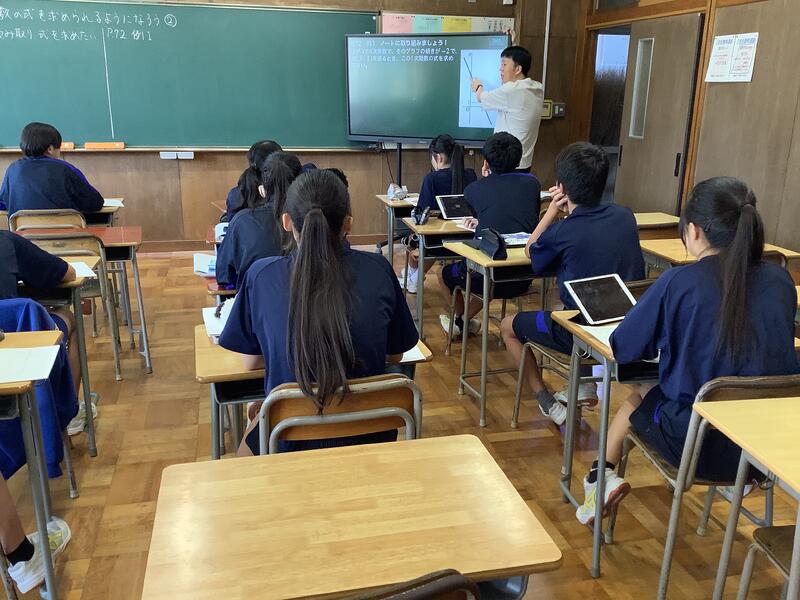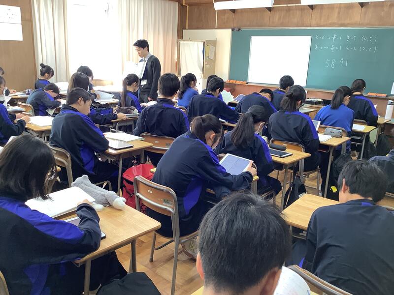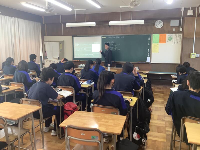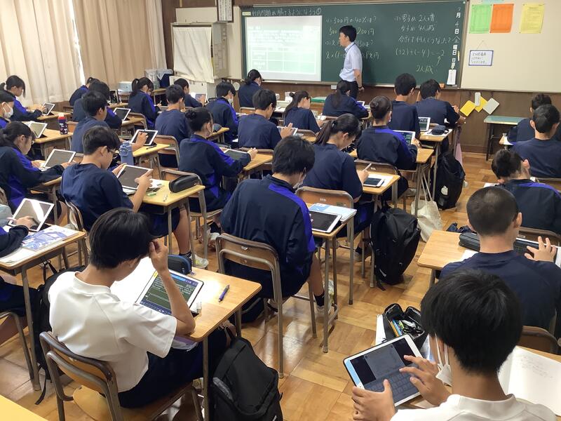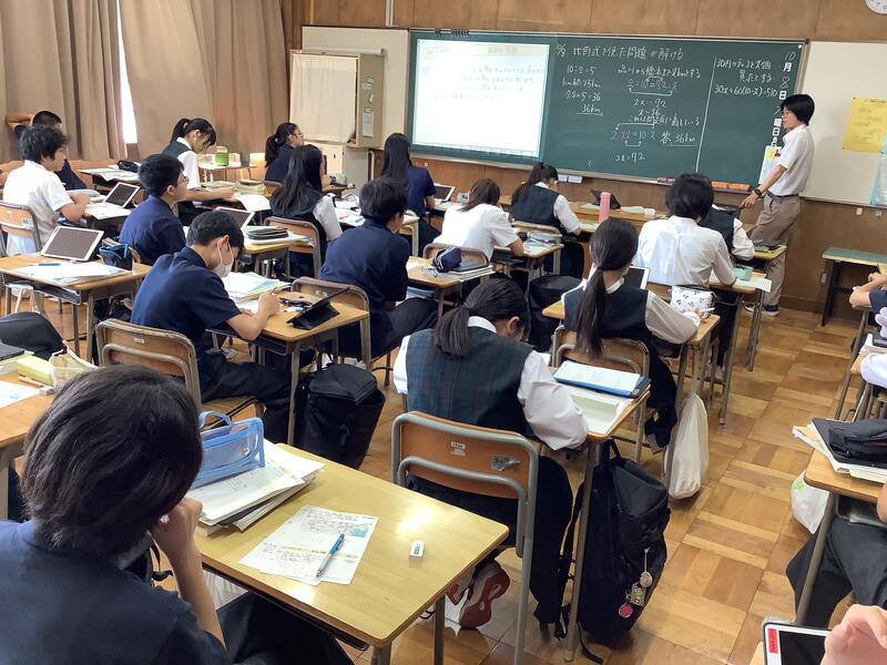 2年生の数学では、連立方程式を利用した問題に取り組んでいました。式の立て方、計算の手順などを確認しながら進めていました。