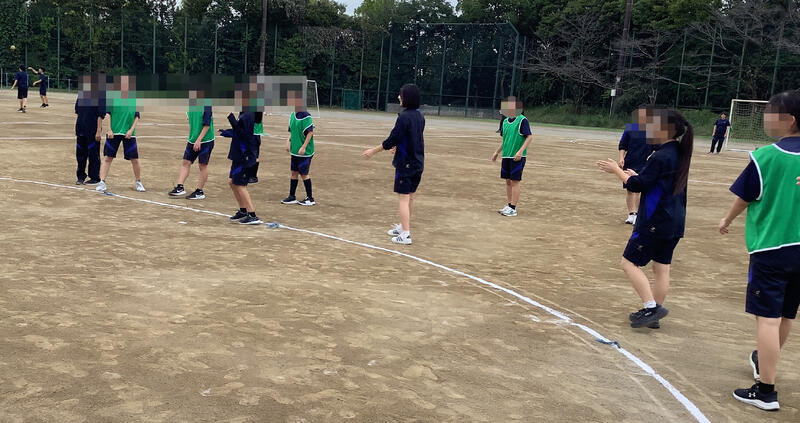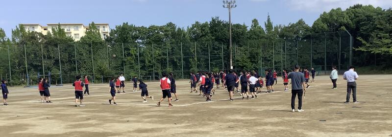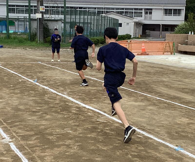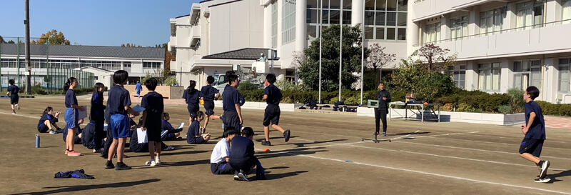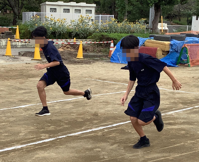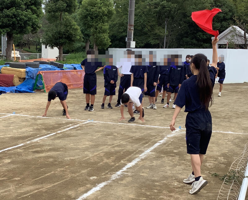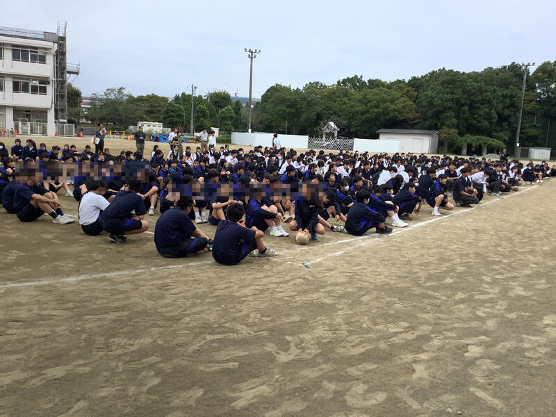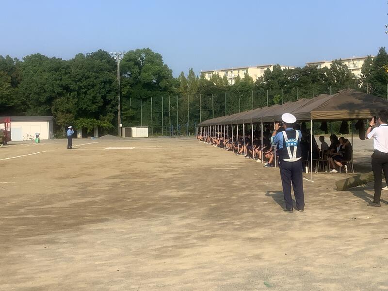 1年生の体育です。日陰で授業の説明を行なっています。水筒も持参して水分補給も適宜行なっています。