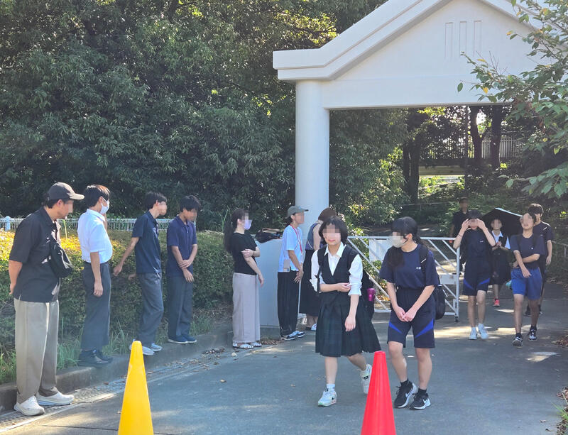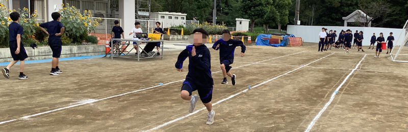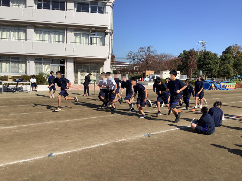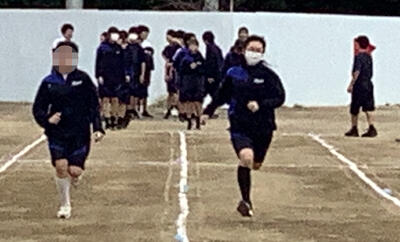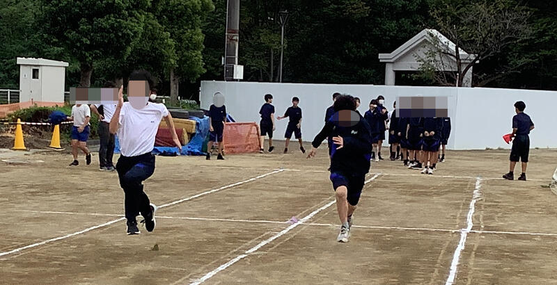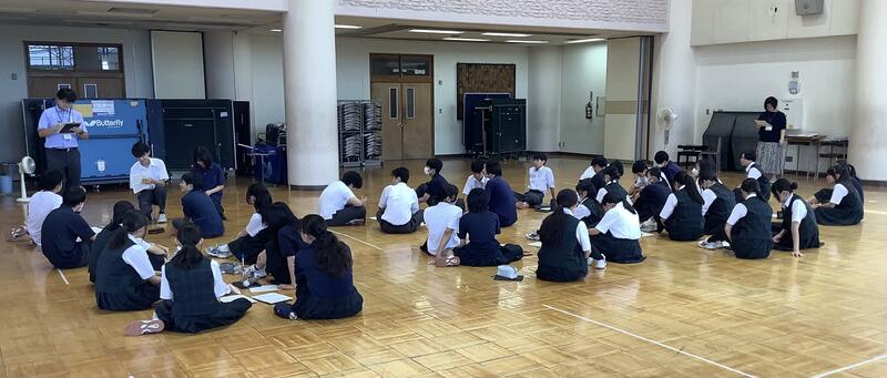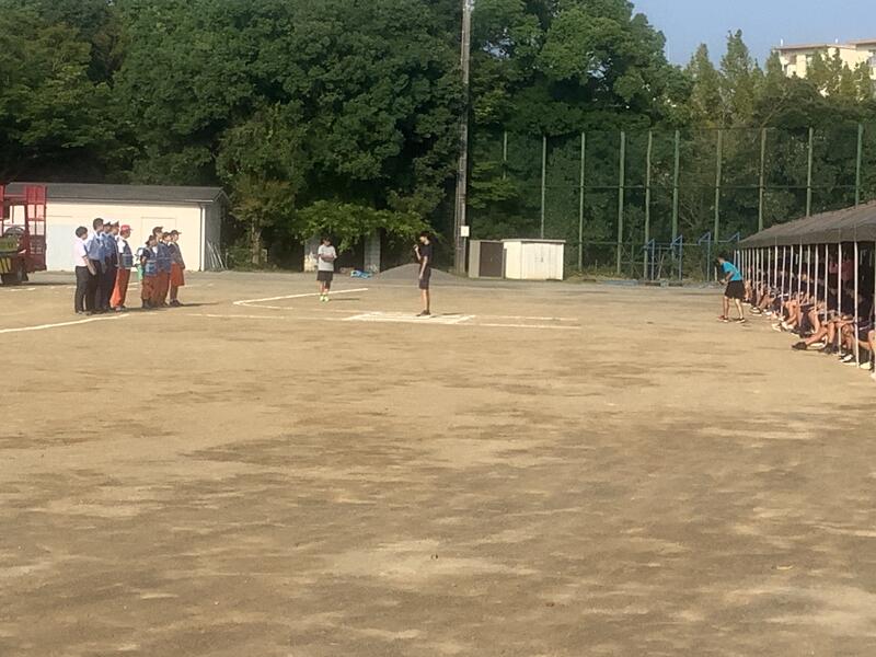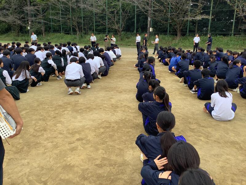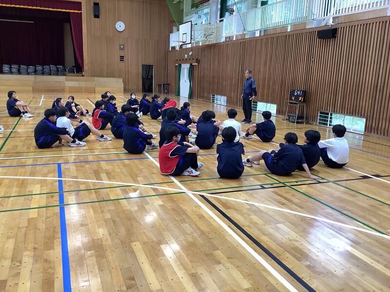 1年生の体育です。日陰で授業の説明を行なっています。水筒も持参して水分補給も適宜行なっています。