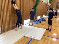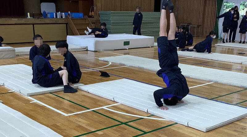 今日は、1年生の体育の時間に、教育実習生の研究授業がありました。これまでに学習した技の復習をするとともに、マット運動の発表会に向けて、演技構成を考え、練習する授業でした。