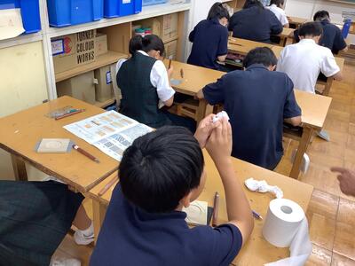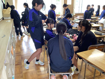 また、身の回りにあるものを使用して止血する方法や、スリッパの作り方を学びました。これまでに学習してきた防災に関する内容と合わせて、御家庭でも話題にしていただければと思います。