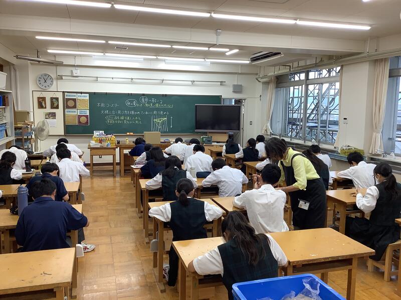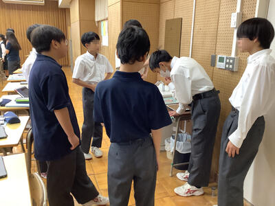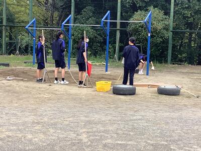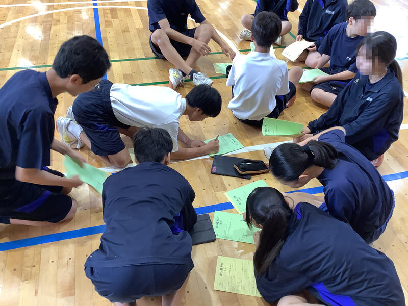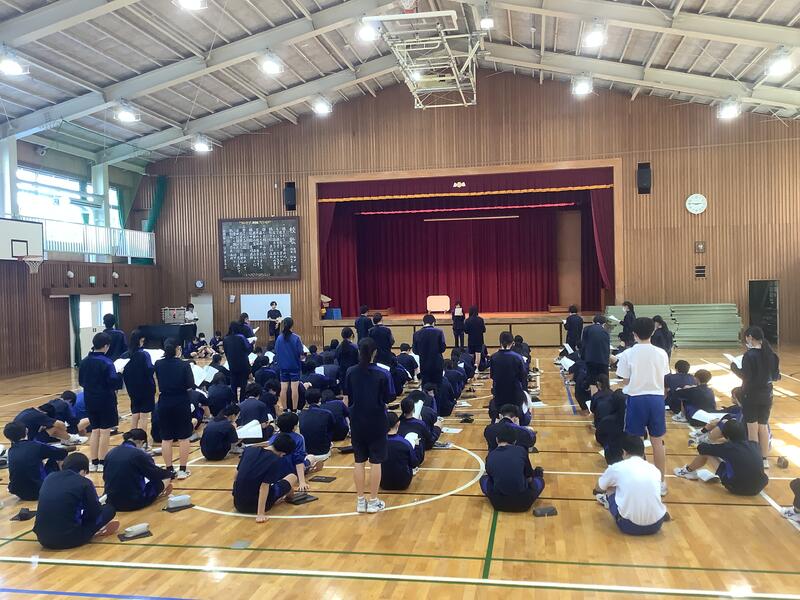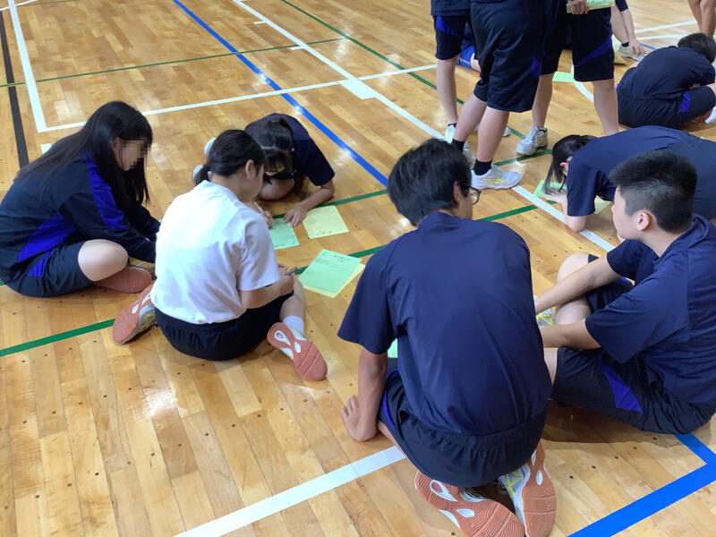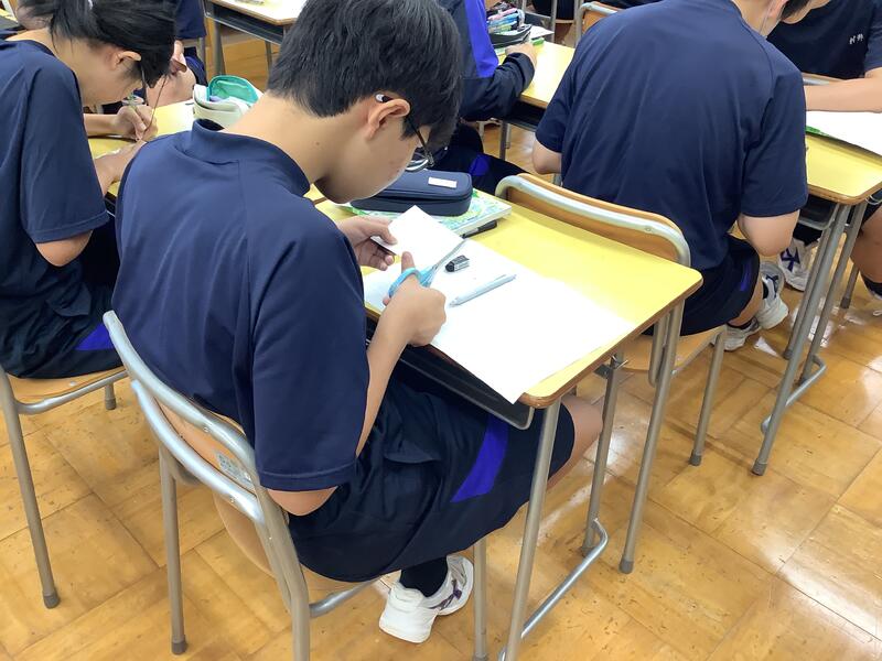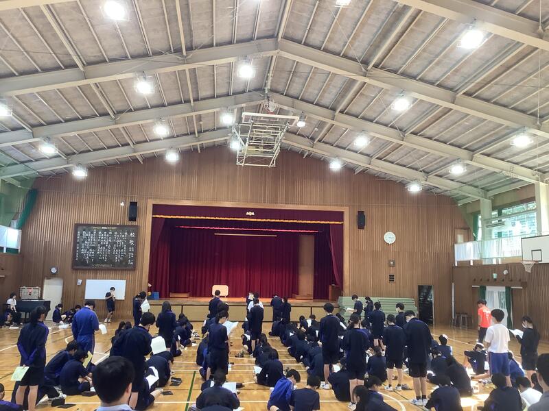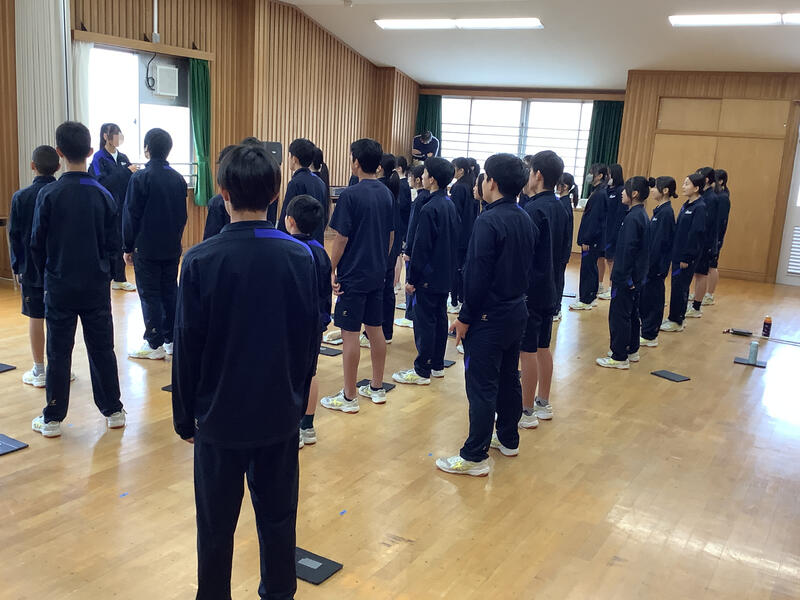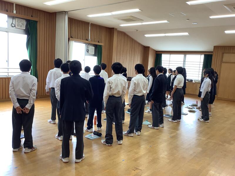 今日は、1年生が防災デイキャンプを行いました。日本赤十字社から講師の先生をお招きして、自助、共助の大切さについて教えていただき、実際に避難所で中学生としてどのようなことができるかを考えました。