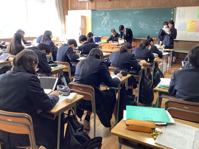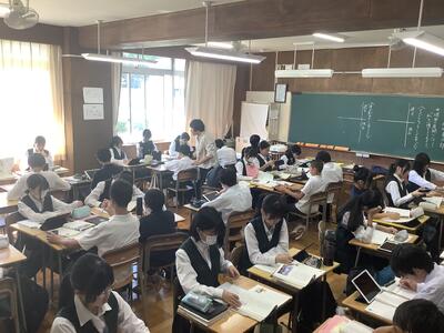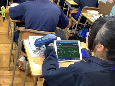 3年生の数学です。根号を含む式の計算に取り組んでいます。加減に取り組むグループもありました。このグループでは、乗除の方法を学習していました。分母の有理化などについて学んでいました。