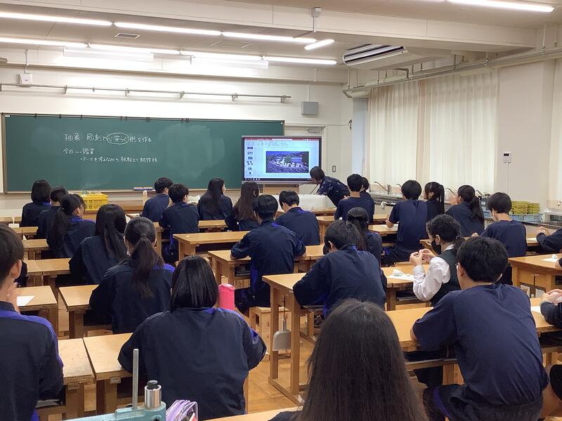 1年生の美術では、彫刻に対するイメージや、自分たちの住んでいる身近な所にある彫刻作品を確認した後、スライドを活用して、実際の彫刻作品に触れていました。
