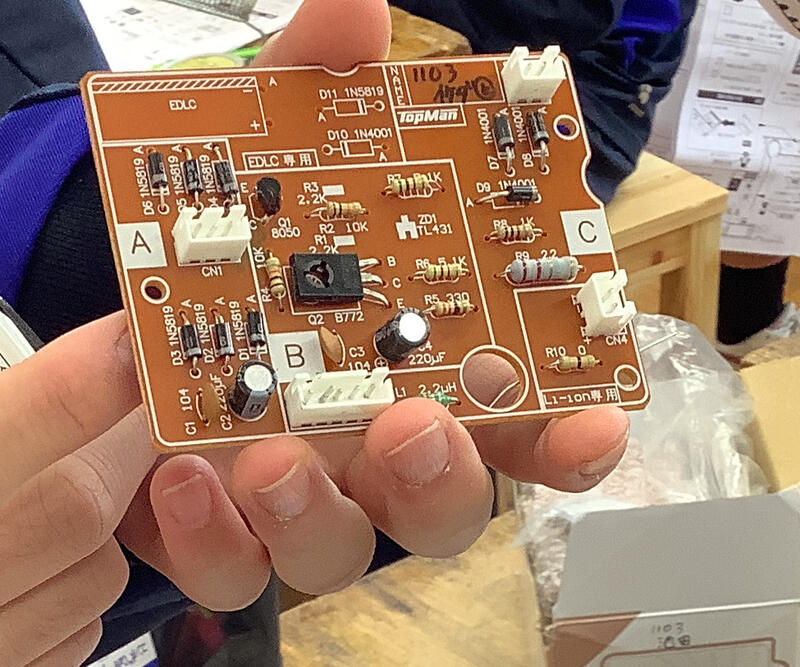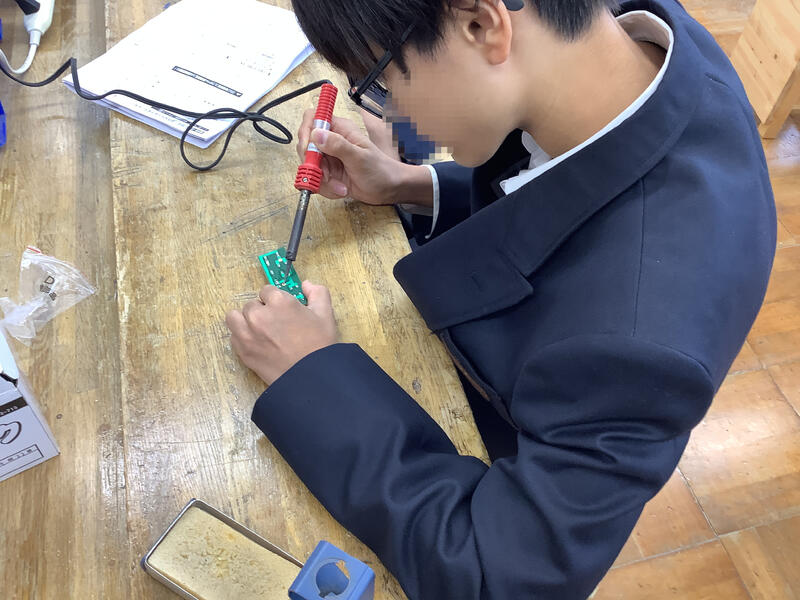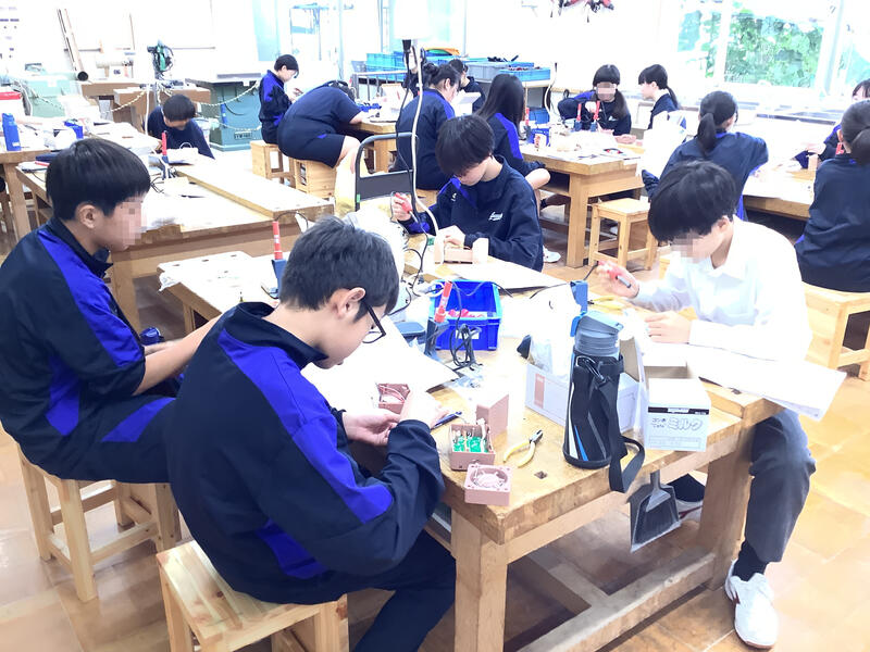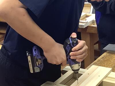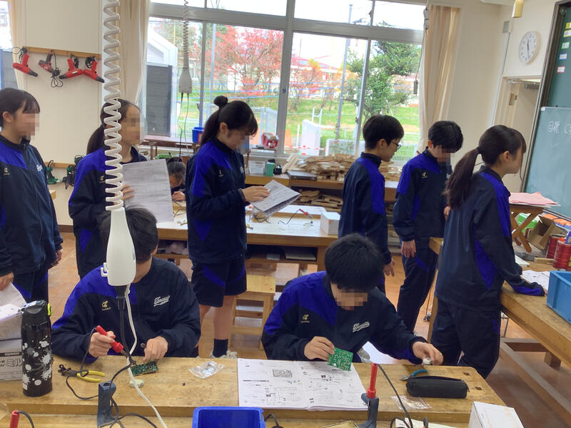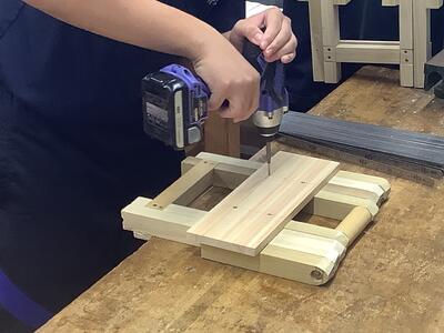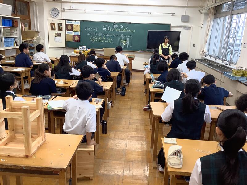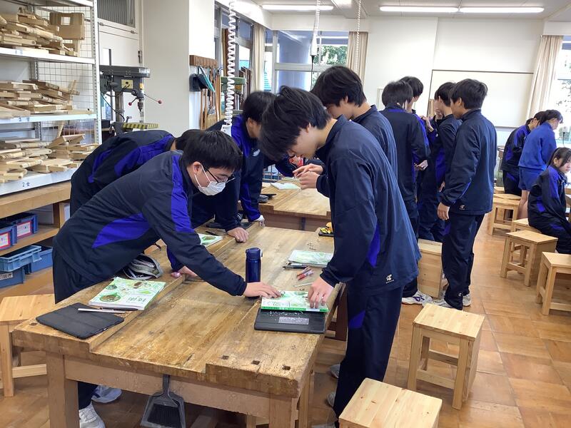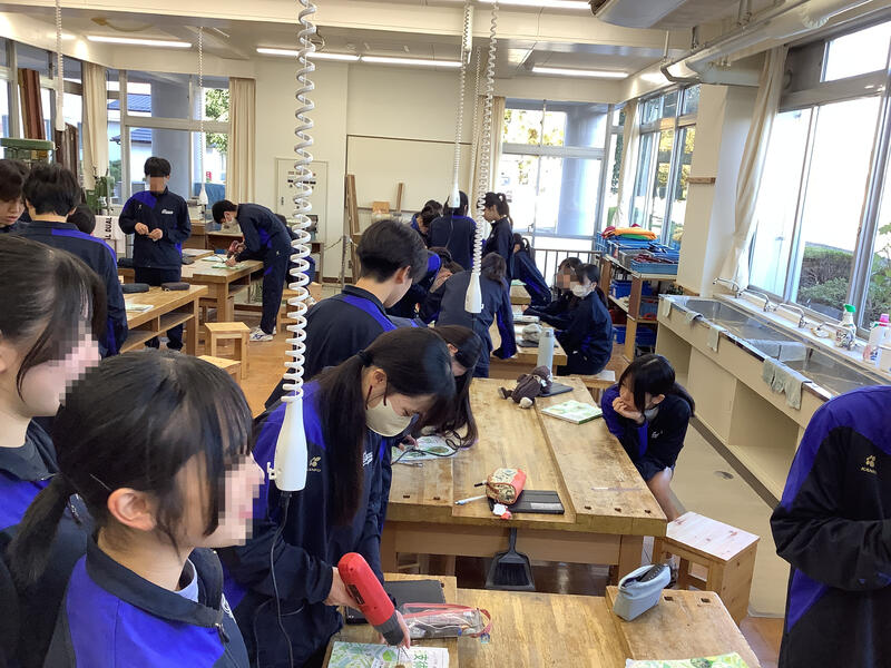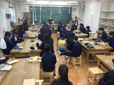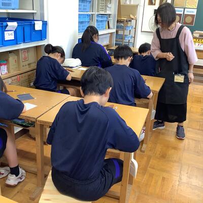 ・2年生の技術科、椅子の作成です。椅子自体はほんとんどの生徒が完成していますが、座面に装飾をしていますが、まだまだこれから仕上げです。