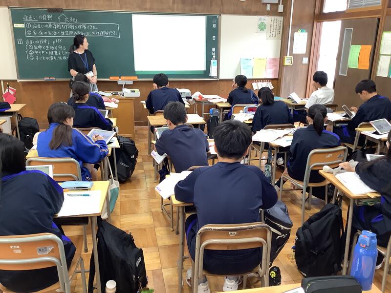 3年生の家庭科では、文字の積み木の製作を始めています。下書きをして着色する作業の説明の場面です。