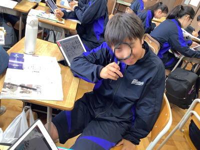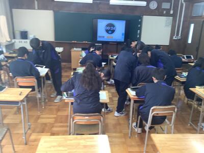 技術では、プログラミングについて学習をしています。画面上のキャラクターを適切に動かすためのプログラムを確認していました。