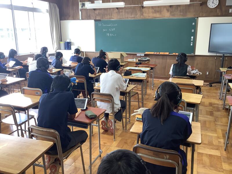 ・1年生英語。ネイティブな英語を聴いて、何を述べているかを確認しています。