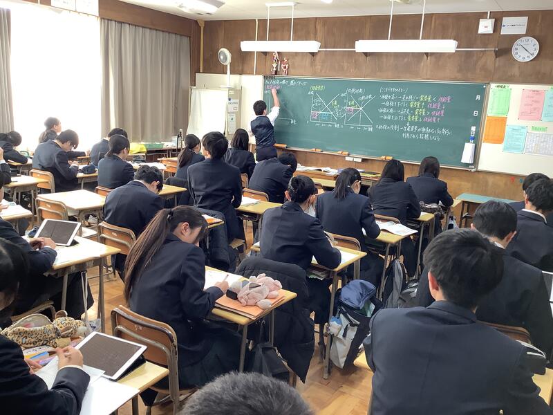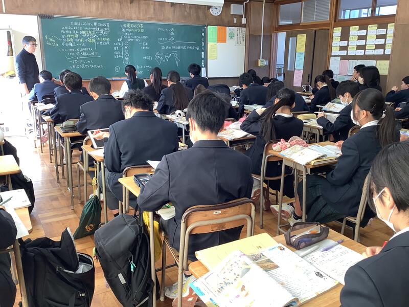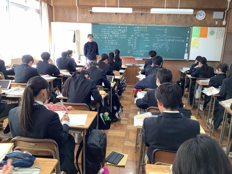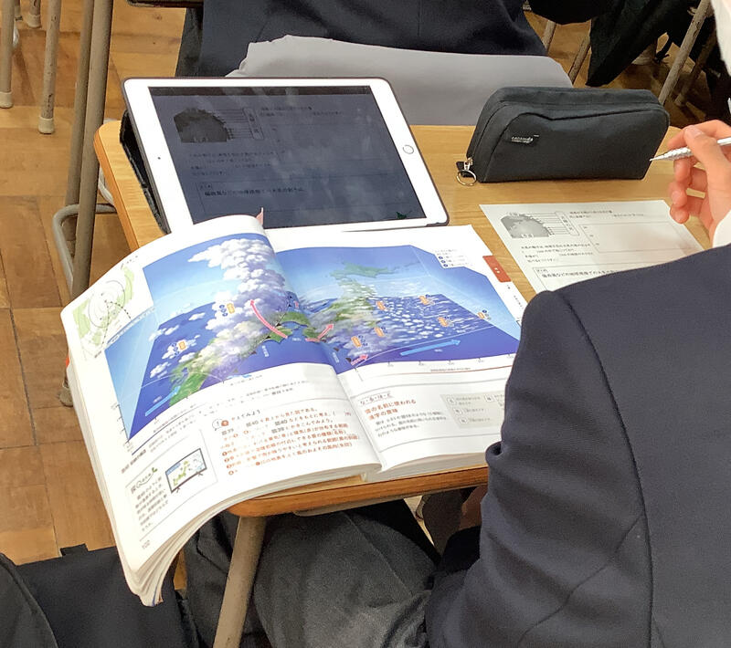 ・2年生理科です。地球規模の中で待機はどのように動いているか。雲の発生状況など教科書はカラーで見やすくまた分かりやすく書いてあります。欠席者が目立っています。