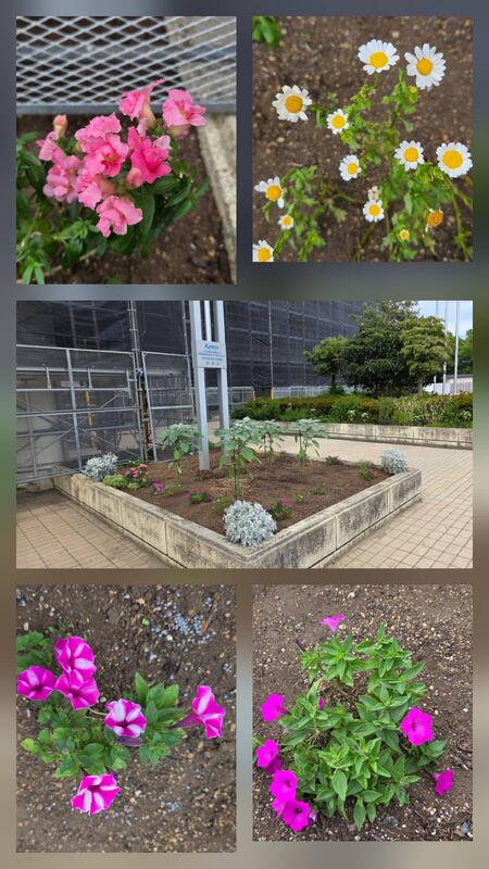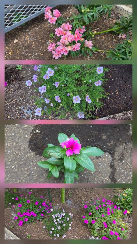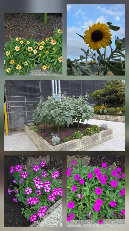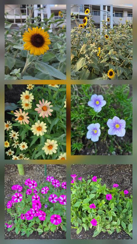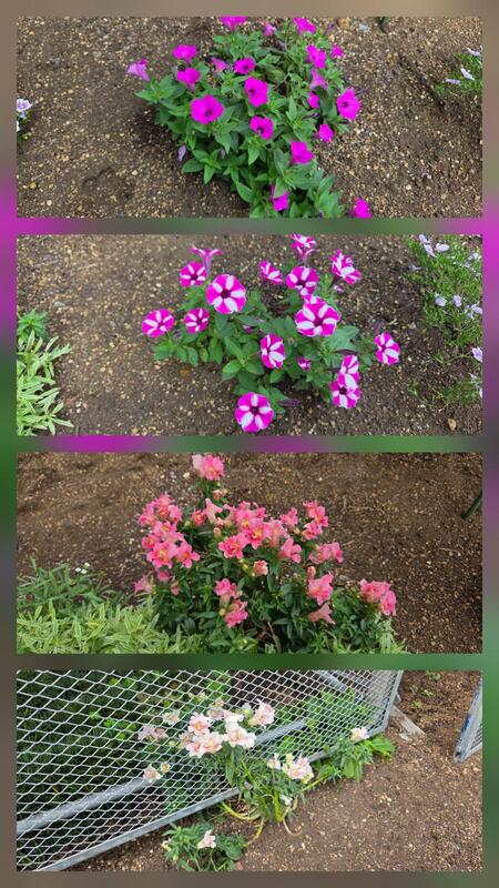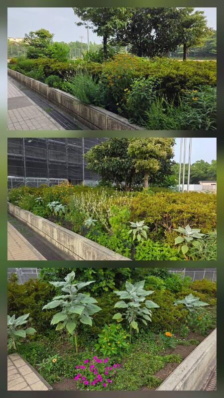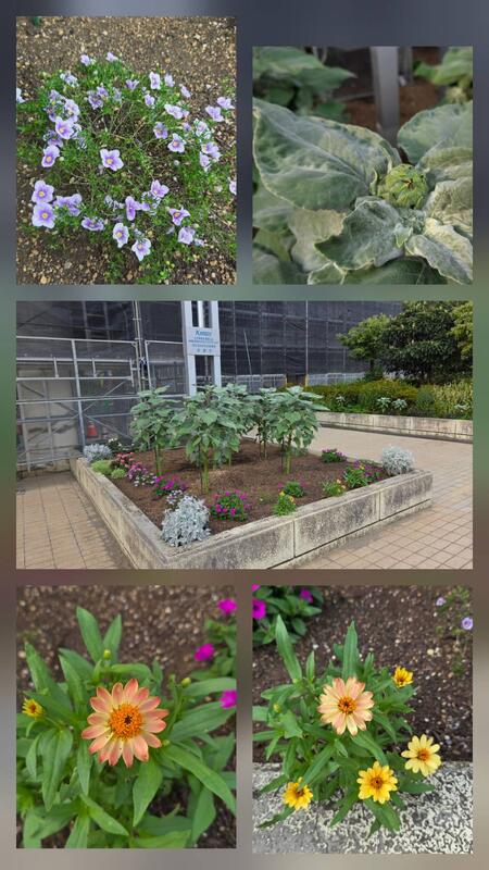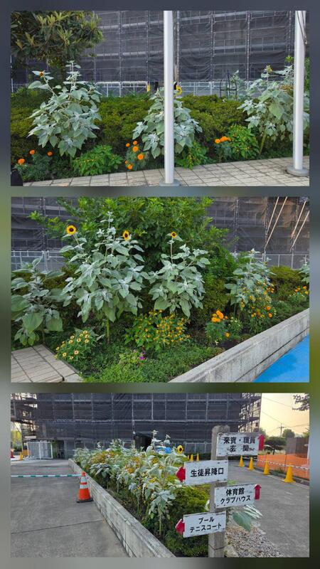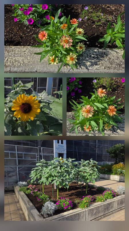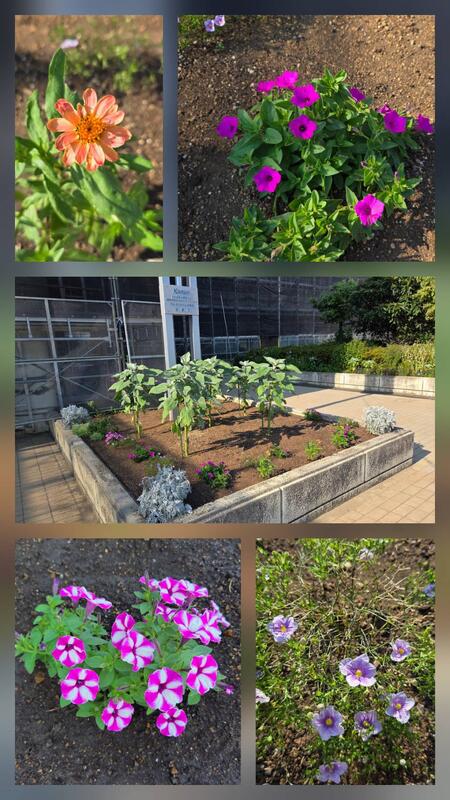 ◆メインの花壇では、ニーレンベルギアオーガスタ、ジニア、ペチュニア、キンギョソウが咲き、ひまわりは順調に生育中です。