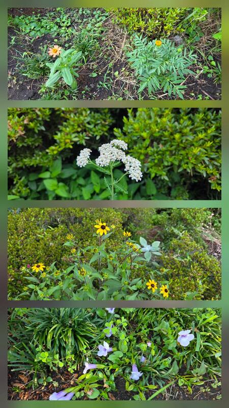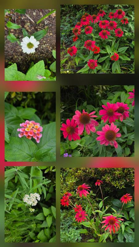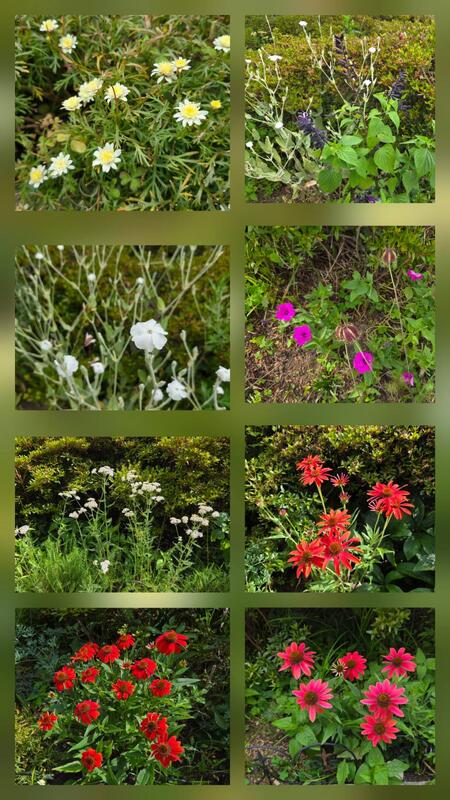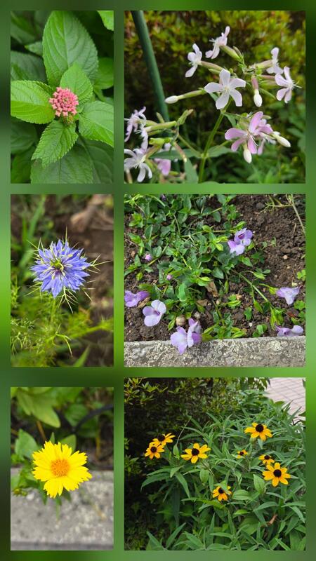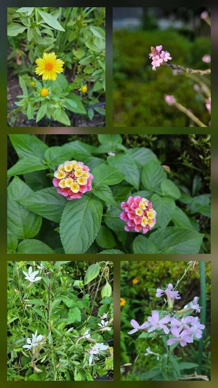 ヤロー、ルドベキアタカオ、トレニア、コレオプシス、バーベナバンプトン、ランタナ、ガウラ、サポナリア、エキナセア、メランポジウム、リクニスコロナリア、ペチュニアが咲いています。