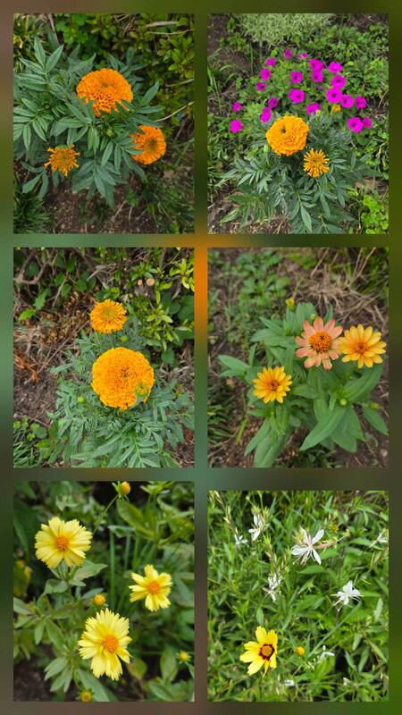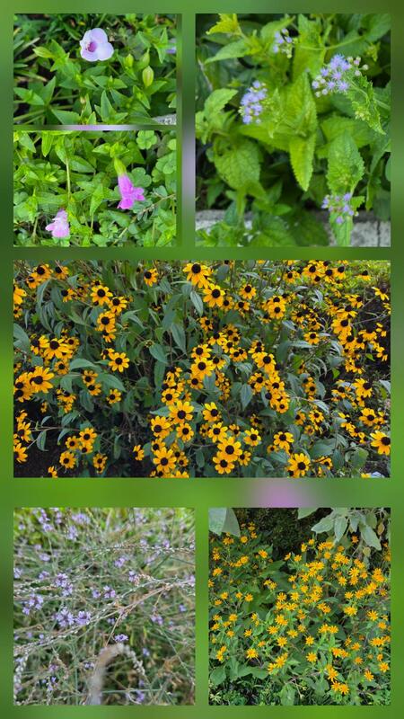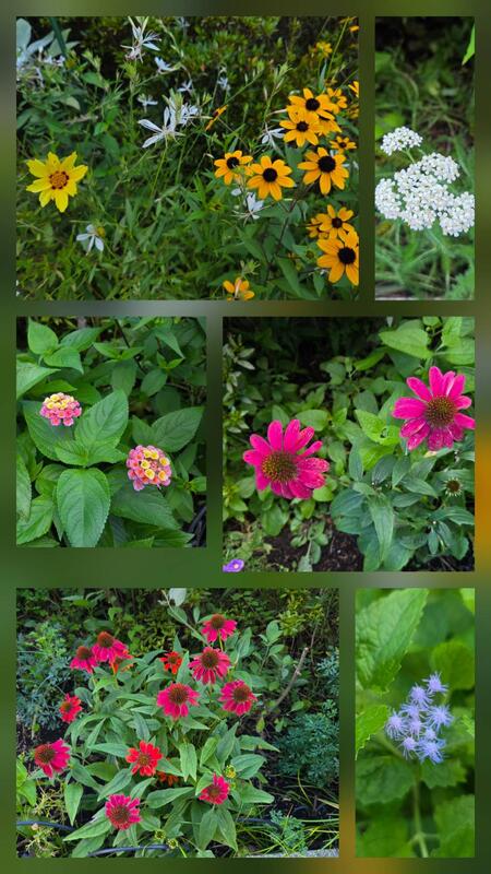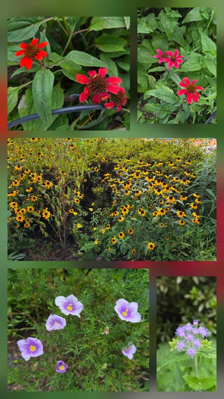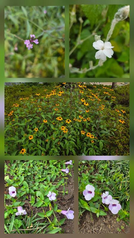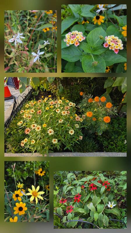 ルドベキアタカオ、ペチュニア、アフリカンマリーゴールド、ジニア、トレニア、コレオプシス、ガウラ、ヤロー、ランタナ、エキナセア、ユーパトリウム、バーベナバンプトン、リクニスコロナリア、サポナリアが、咲いています。
