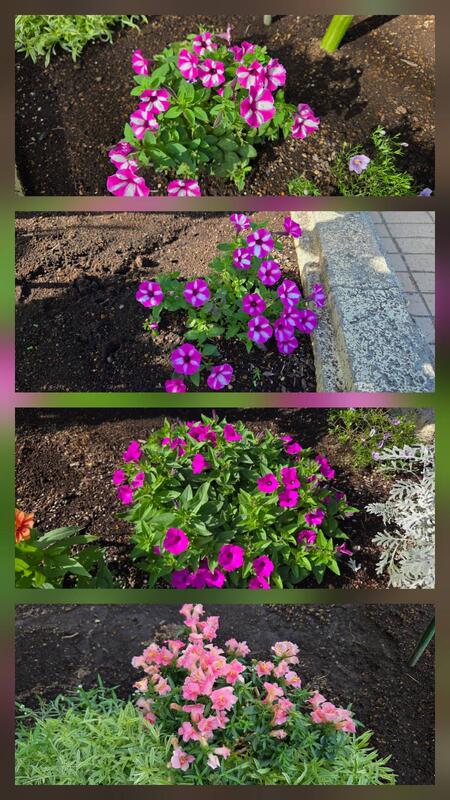 ◆メインの花壇では、ジニア3株が仲間入りしました。ペチュニア、ニーレンベルギアオーガスタが咲いています。