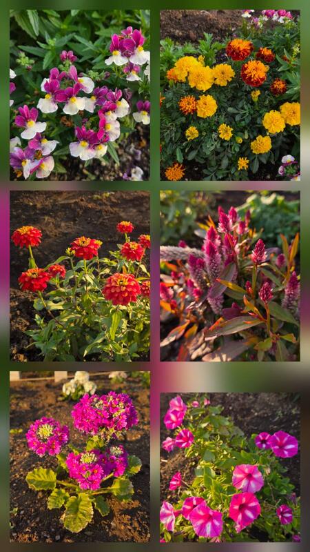 ペチュニア、マリーゴールド、メランポジウム、ジニア、プリムラマラコイデス、ネメシア、キンギョソウ、セロシア、ビオラが咲いています。