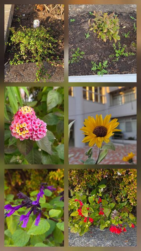 ガウラ、ランタナ、タマスダレ、ジニア、ひまわり、サルビアコクシネア、アメジストセージ、シュウメイギク、スーパーサルビアロックンロール、アリッサム、メランポジウム、トレニア、マリーゴールドが咲いています。