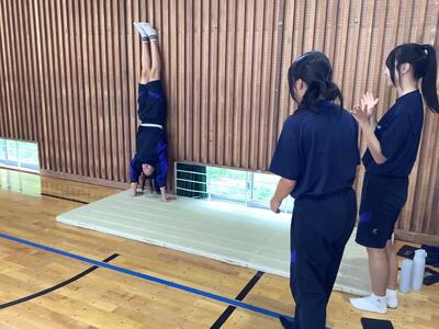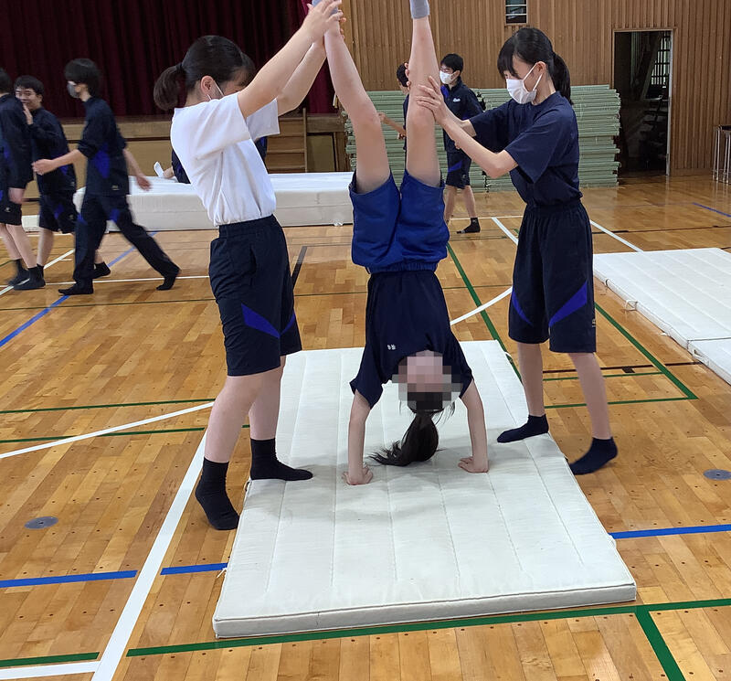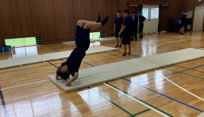 〇3年生のマット運動の授業です。倒立がしっかりできています。大変上手です。