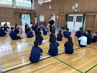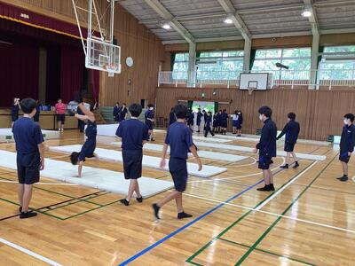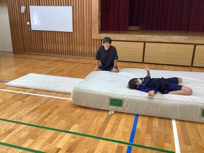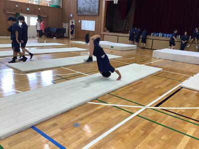 体育では、柔道に取り組んでいます。教育実習生も授業の補助に入り、受け身の練習をしていました。先生の模範の動きを見て、一つ一つの動きの中で気を付けることを確認し、安全に配慮しながら進めていきます。