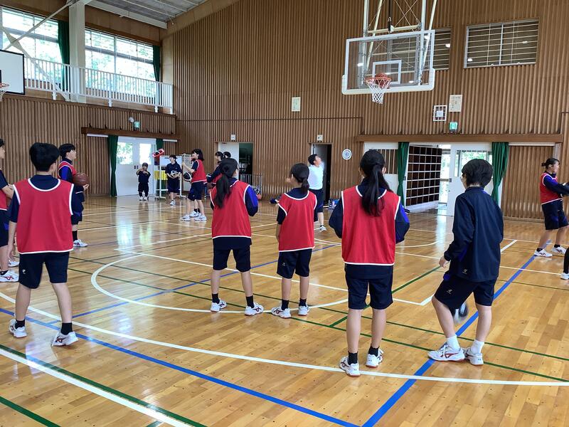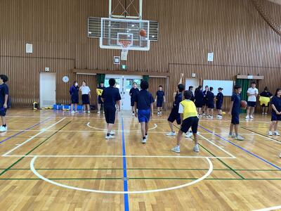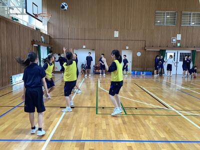 〇バスケットボールのシュートの練習をしています。3点シュートが何回も入っている生徒もいました。