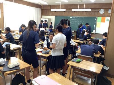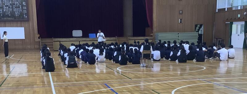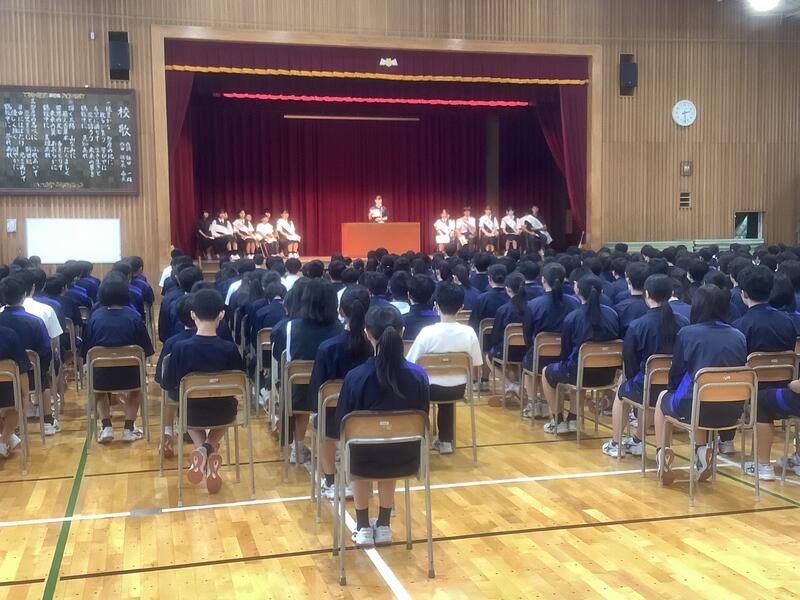 定期考査後に、2年生は学年集会を行いました。今後の生活に向けて、仲間との関わり方について大切な話がありました。また、学校の中心として、今日から始まる後期の委員会等や職場体験、校外学習へ出かける際の心構えについて話がありました。