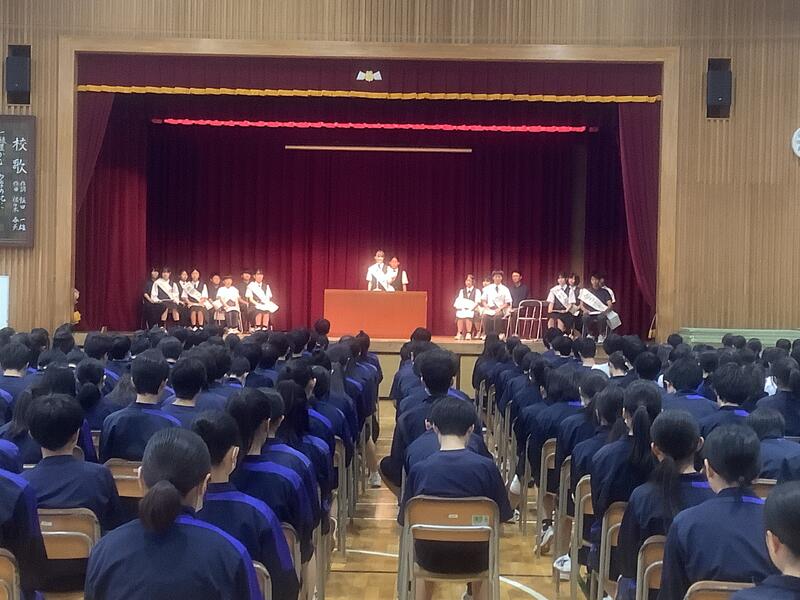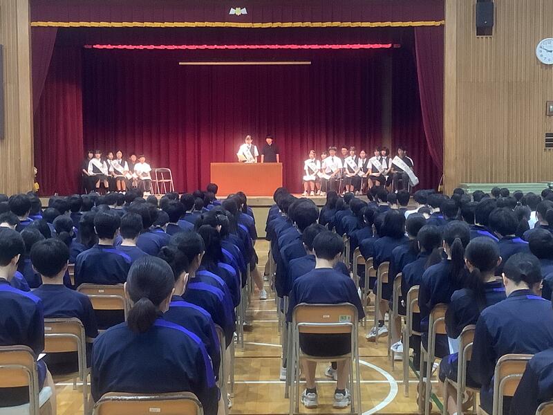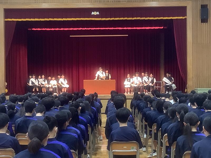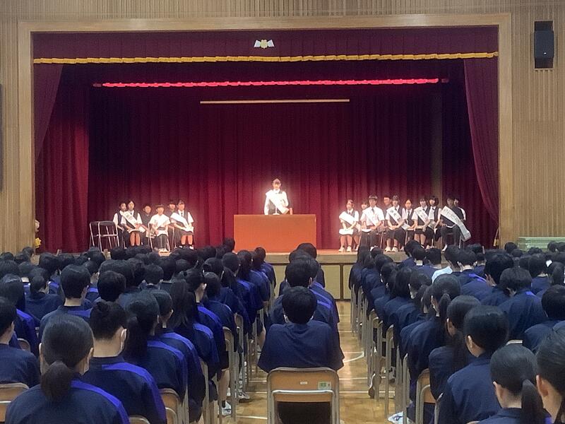 立会演説会では、壇上に上がった立候補者は、自分の言葉で立候補の理由や生徒会役員としての抱負を伝えました。また、応援者は、立候補者のよいところ、これまでの実績などを伝えました。フロアでは、静かに真剣に候補者の演説を聞く姿がありました。新しいリーダーを決めるにふさわしい演説会となりました。