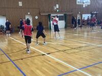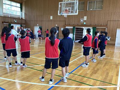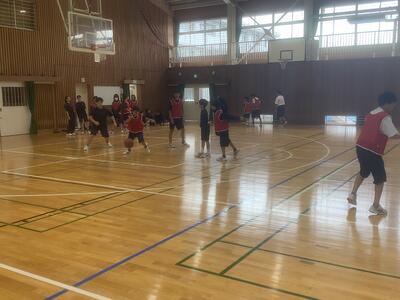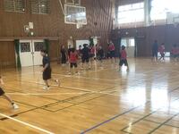 1年生の体育です。今日は、フロアを半面ずつに分けて柔道とバスケットボールを行いました。