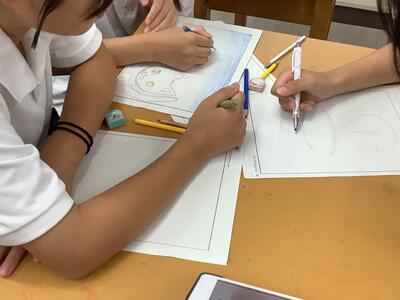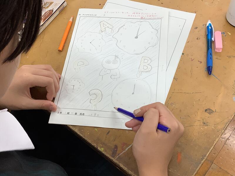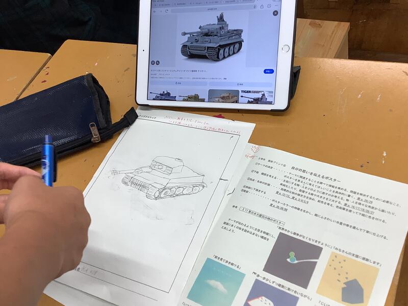 〇美術で、ポスター作製の授業です。先生がアドバイスをしています。